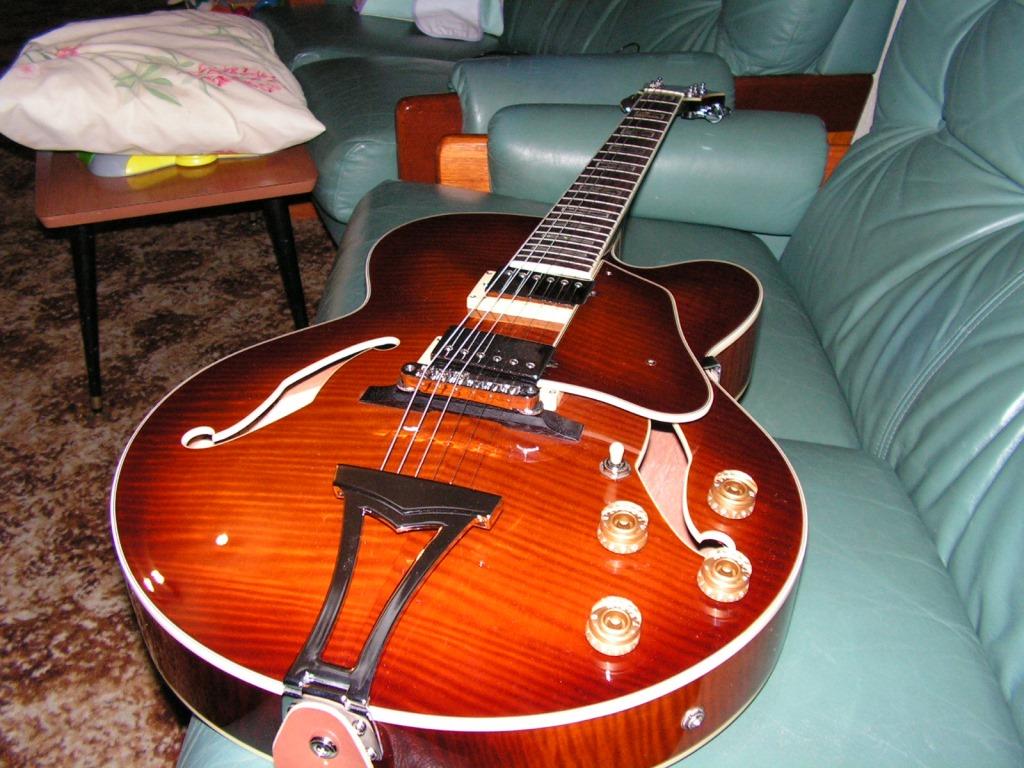 Ibanez did a lot of hollow bodies with wooden pickguards, and the headstock widens at the top end like an Ibanez one. It was just the tailpiece that got me for a while, as it seems quite specific to that model.