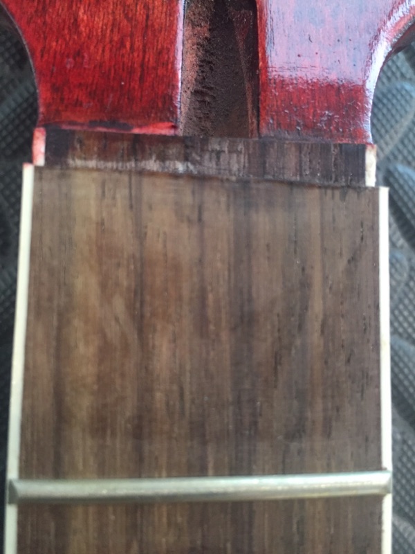 Hi Andy, fingerboard looks nice after the wax. Thats a worry looks like the fingerboard not cut perpendicular. I'd measure high and low side distance from the edge to centre of 1st fret and it should be about 35mm, to work out if it needs to be cut or shimmed so the nut is perpendicular to the fingerboard