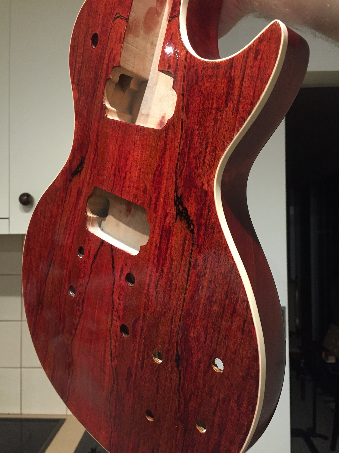 So I thought I would post an update on my finish. I didn't do too well with the DT as a finish with the humidity, despite leaving it a week It hadn't cured properly leaving me with a mess sometimes and I even had to re-stain the headstock face. Regrettably, this time I did not have the patience of a saint (I'll try again DT finish with my next build).