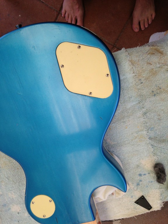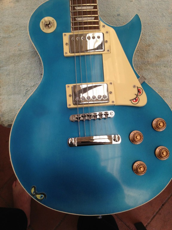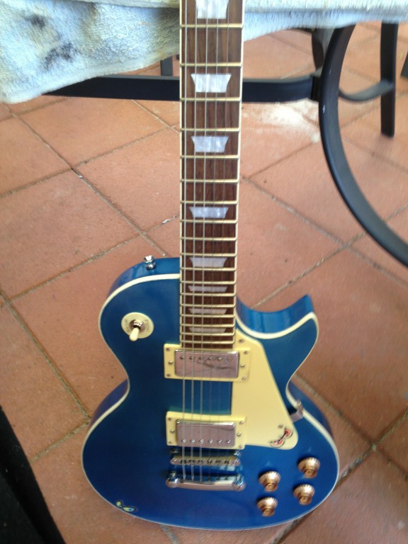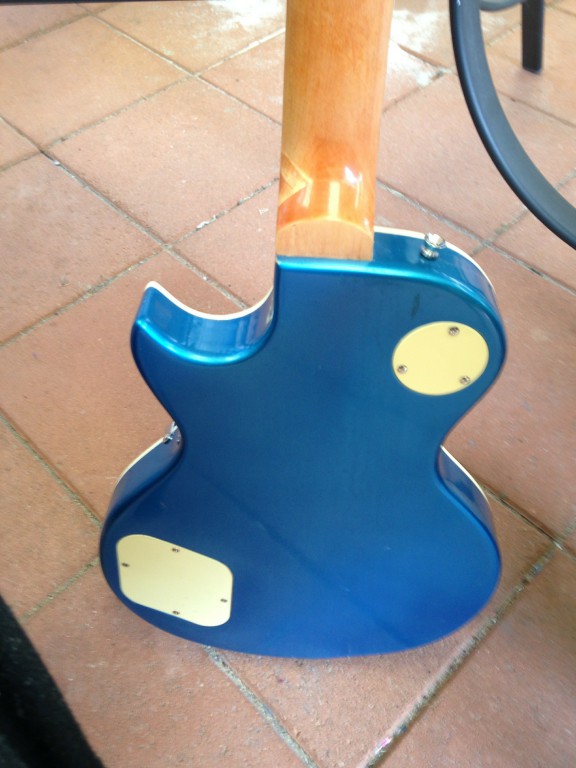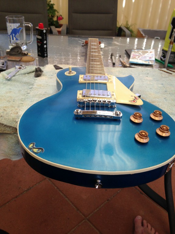 Well I've finally got around to finishing my Lake Placid Blue LP for my grandson. All the parts are stock except for pots, caps & bone nut. I'm very happy with the result for a beginner and am thinking of my next project (Maybe an ES-335). Here's some pixs of the finished guitar.