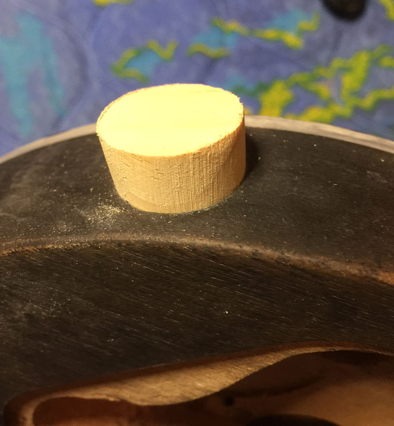 Which meant I had to fill the hole in the side with a 'bung'. I made it by hand with an upside down belt sander, slightly conical to get a good fit.