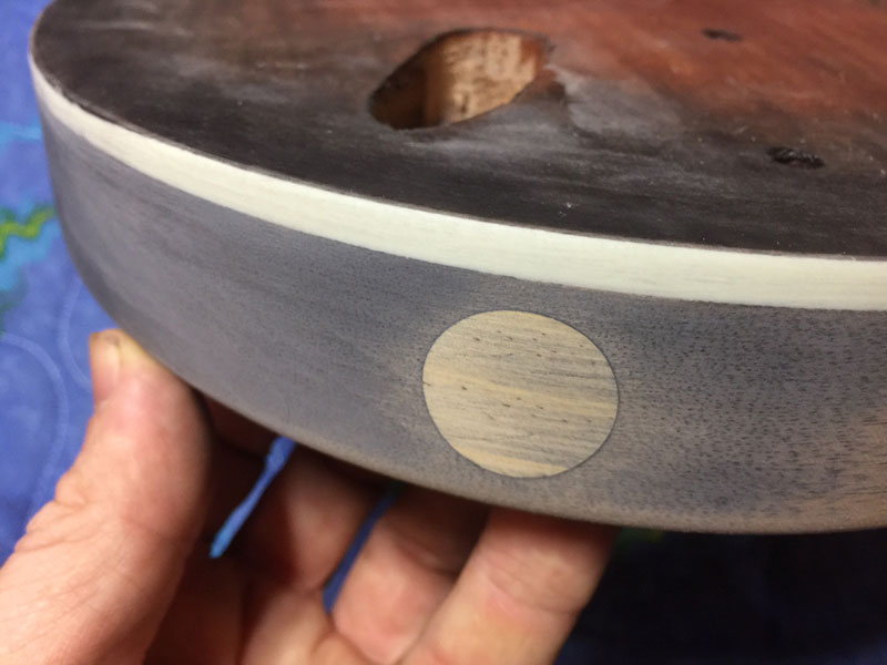 There is also a section of the flame maple that just refuses to take in any black stump. It must be the maple, as it is at the same place on both sides of the bookmatched veneer, just above the level of the bridge pup.