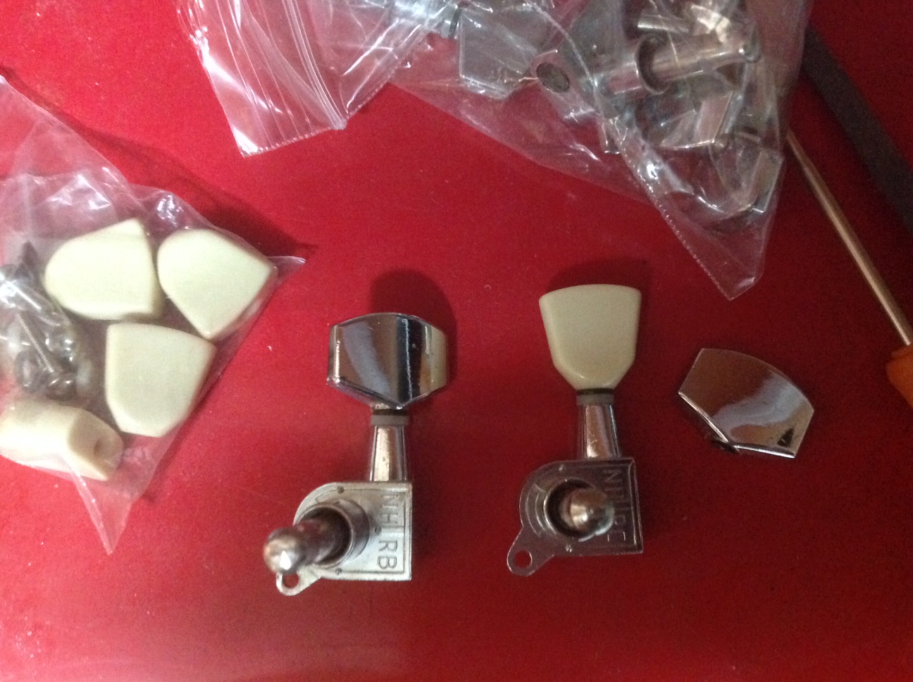 Ok back from holidays and having another look at this. Invested $2.5 in a set of cream buttons for machine heads on eBay, and then found they don't fit the machine heads that came with the kit. So with some filing and fettling they do, and I think will look a whole lot better on this project than the chrome tops.