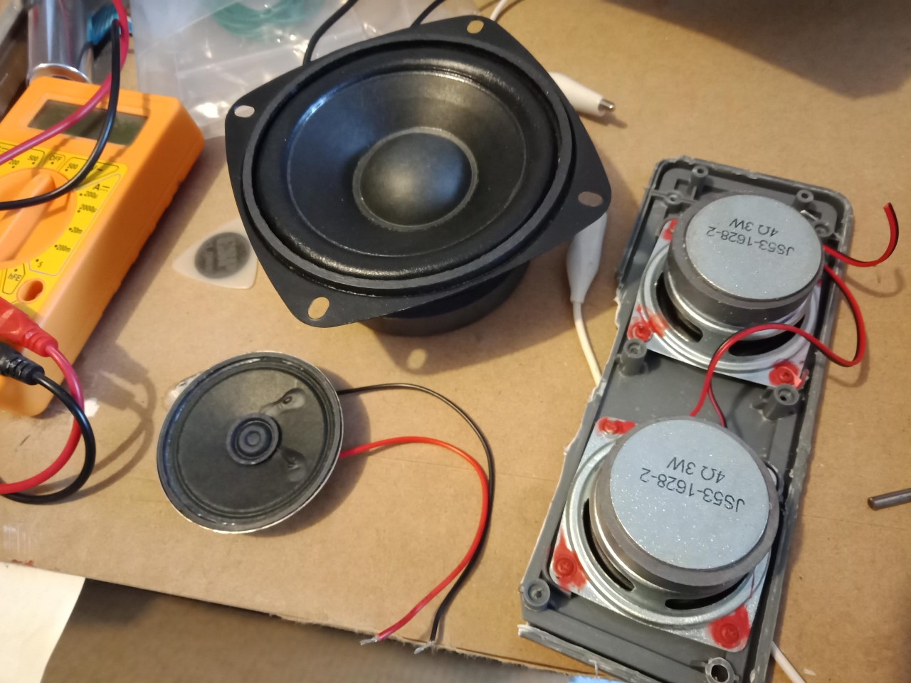 Raided my random speaker box and found I only had these three to choose from. The big guy is a 4" 4 Ohm, then there's a small 8 Ohm and the two small 4 Ohm speakers from an old bluetooth unit. After trying all three the bluetooth speaker gave the best result - a good thud, which was quite loud when I ran it through a boost pedal