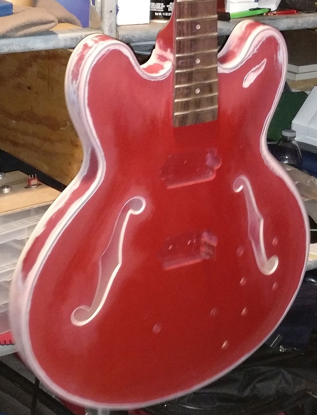 I have been making slow progress with my refinishing. It's not perfect, but it's definitely red--and I have decided I like it better than I like doing anything about it. Will post some pics when I have put all the parts on it, but before I do that...
