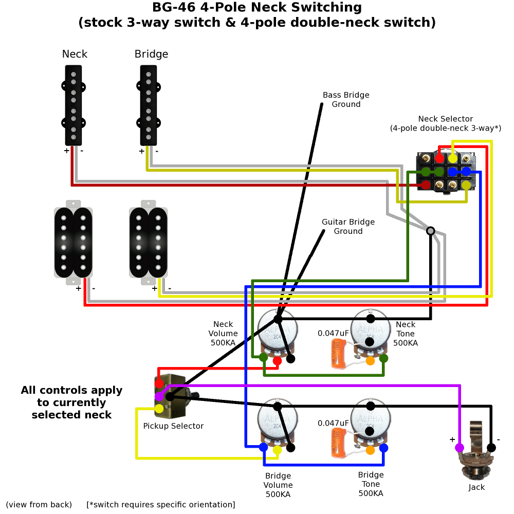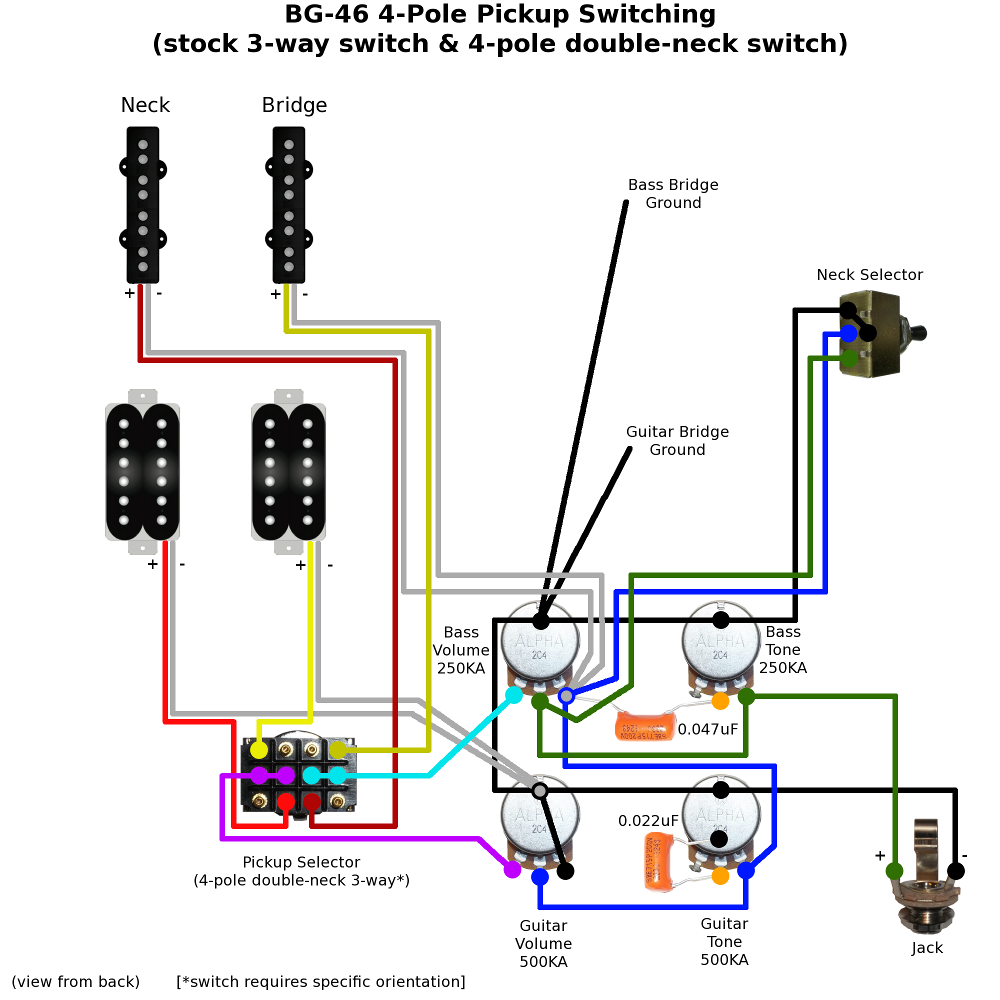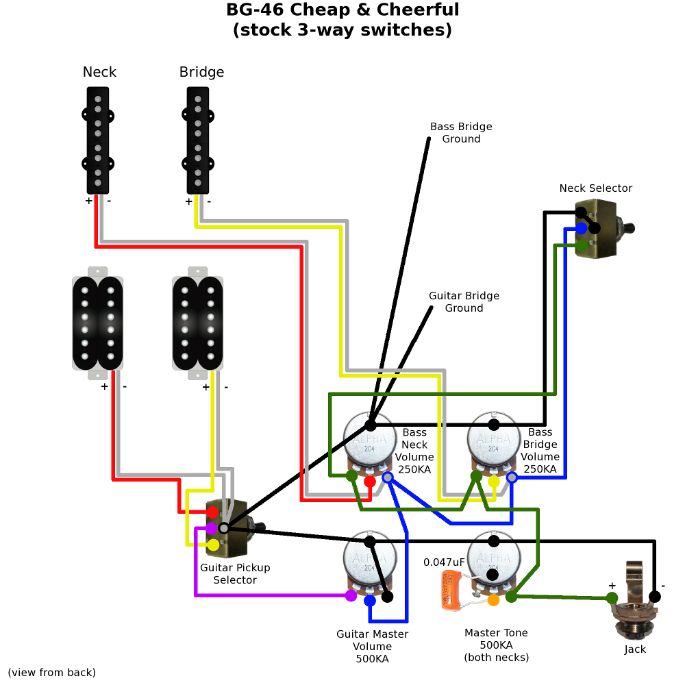 I'm not sure of the exact parts supplied with the BG-46, but from the store images it looks like both switches are just the standard 3-ways. This means we need to get creative if you want true Bass/Off/Guitar style double-neck switching without spending cash on special switches. For the pot and cap values I'm going with what you find in most of the kits and the preferred values for bass/guitar etc. And, following your brief, the diagrams are set up so there's no extra holes, routing or cavity changes required (maybe some minor tweaks to squeeze in a larger switch).