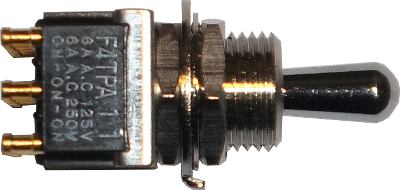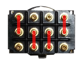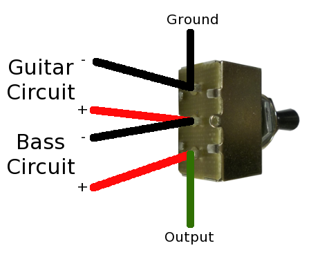 An important note with this switch is the contact layout. With the toggle up or down the contacts are all on one side or the other, but in the middle position the contacts are staggered which makes the switch's orientation important. For the following diagrams to function correctly the switch must be orientated so that when in the middle position its contacts are linked like so: