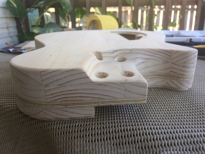 But it was then that I realised that as the body is much thicker than a standard electric guitar the neck screws I had bought were way to short. I would have to leave the ferrules deeply recessed. Then thought that I would bevel the area behind the neck pocket to give me better access to the higher frets. Then I thought, what the heck, why don’t I just try and shape it a bit. So I did.
