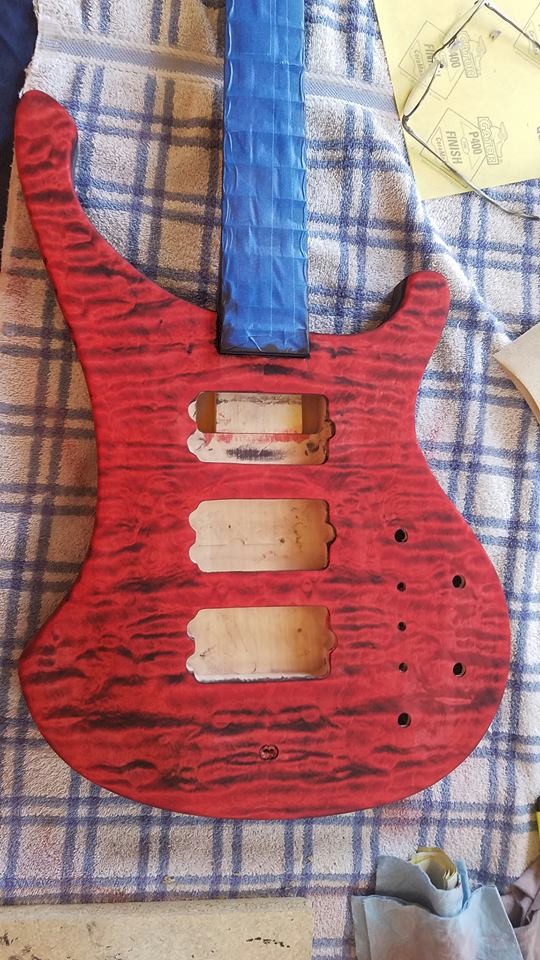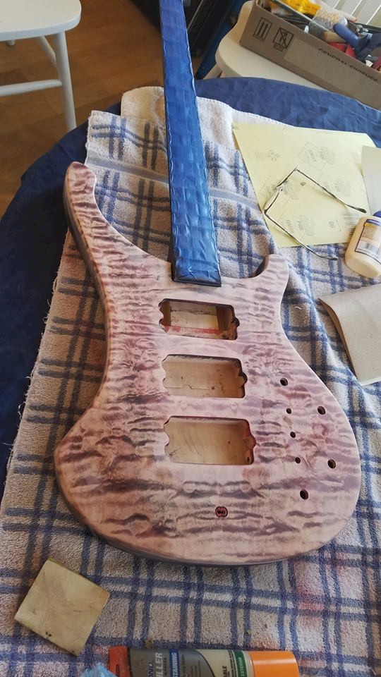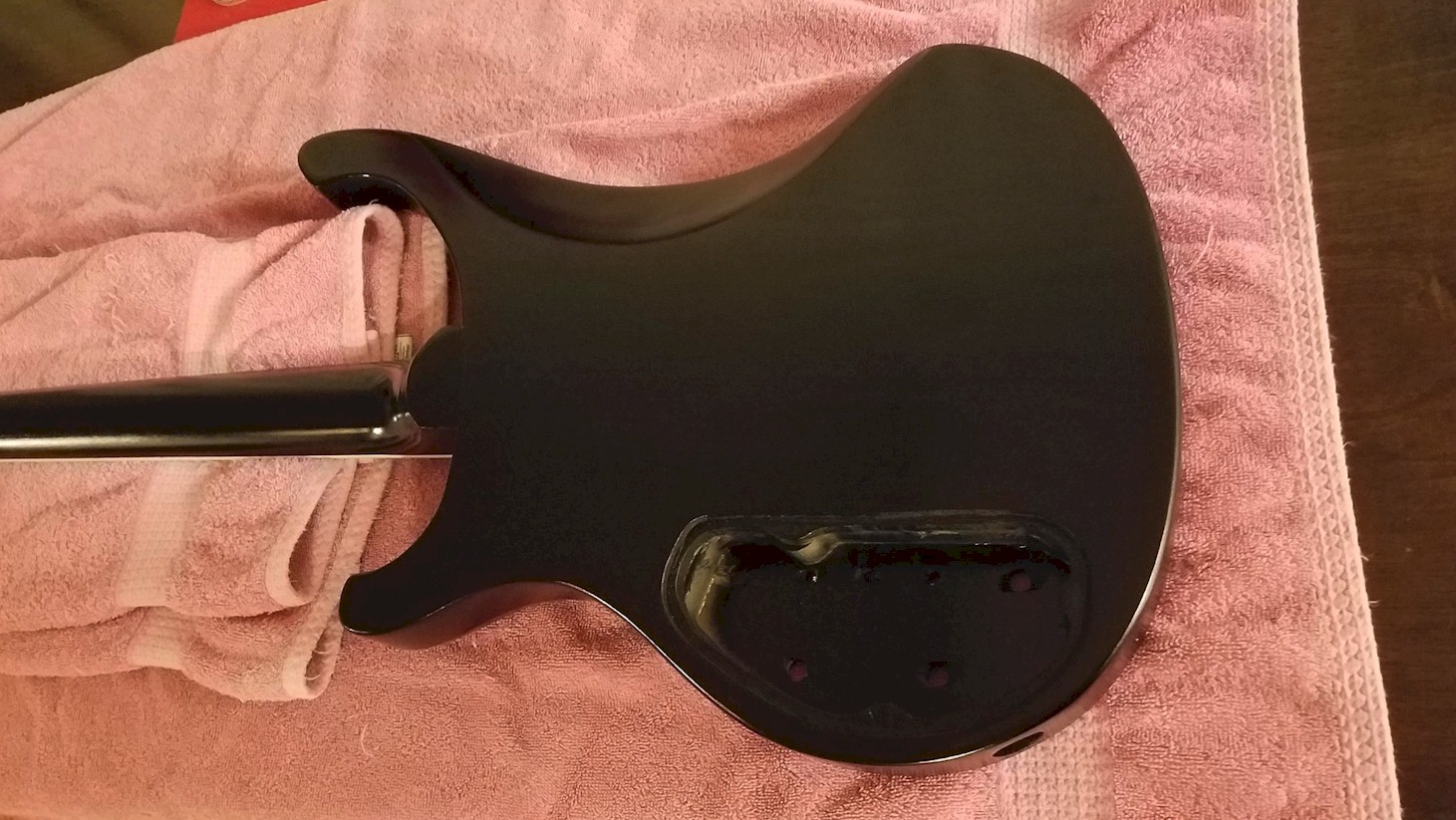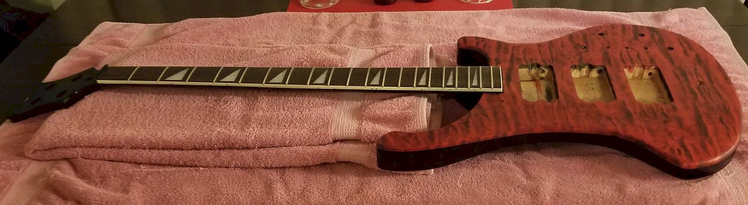 Came out pretty clean. I can see one spot where I need to clean up some black that got past the tape (Frog Tape is good stuff). Now moving on to clear for the entire guitar...8-10-12 coats? As many as I can get out of these three can's I think...surprised by the result...I actually sprayed this on my front porch. Had one tiny, fairly flat-ish run that I'm hoping will disappear with the clear (can barely see it), but there is one spot inside one cutaway that I don't know if it's going to fill...we'll see...