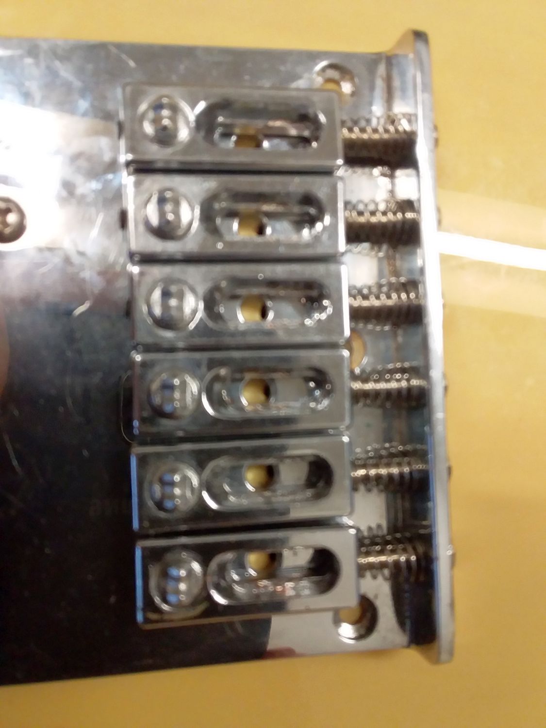 Here's a closeup pic of the bridge, note that the saddles aren't the originals, they are some longer ones I found that I'm going to try and see if they solve the scale-length issue: