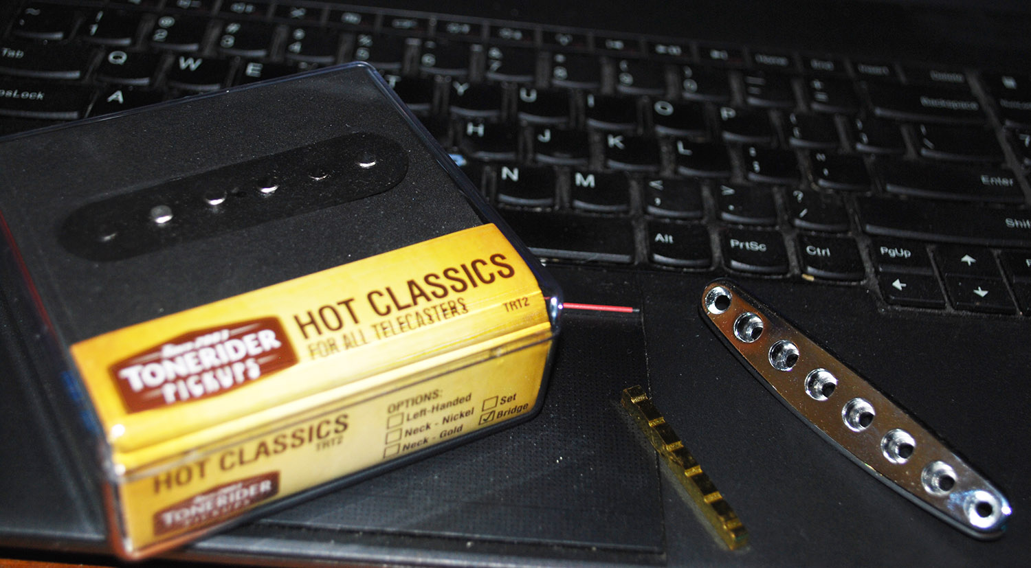 Last remaining items finally arrived: brass nut, string through ferrule and the Tonerider bridge pickup.