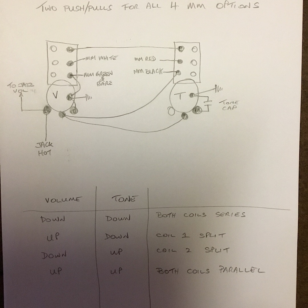 I split the red and white leads from the MM pickup...one to either side on the middle connectors of the push pull pot....the bit above the normal pot....the black to the normal hot input connector and the green and bare to the earth.