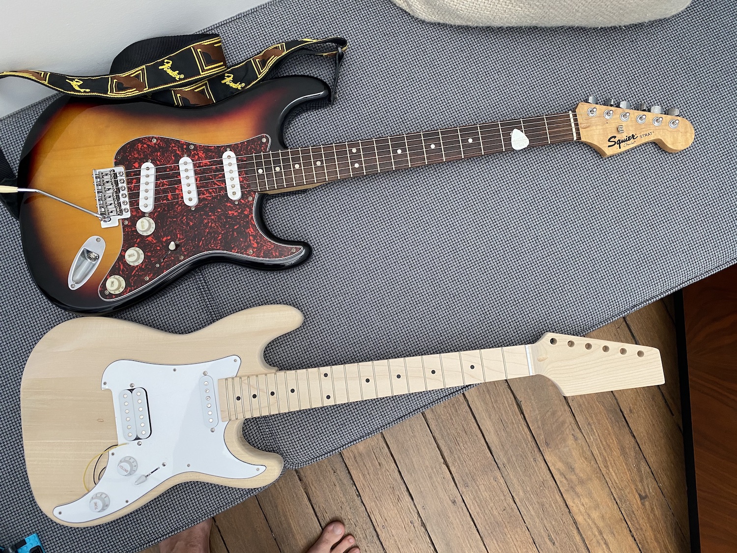 A quick side-by-side to the big brother Squire (only mod on that is dropping in a Fender full block trem, thankfully had a full thickness Squire that let me do that)