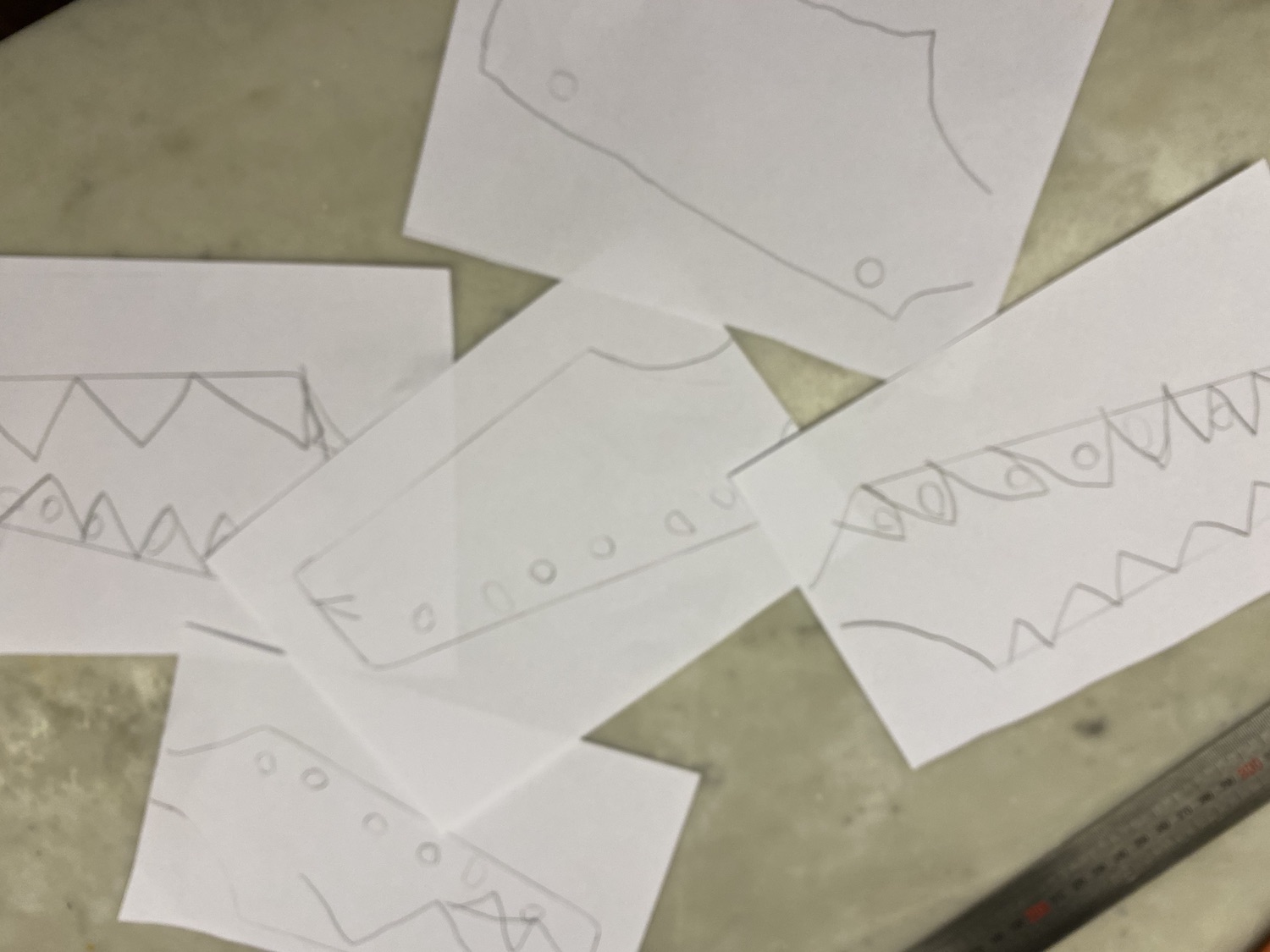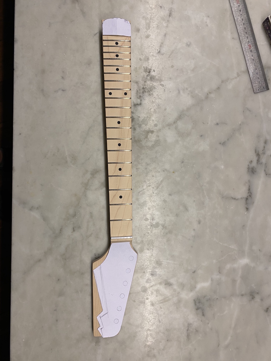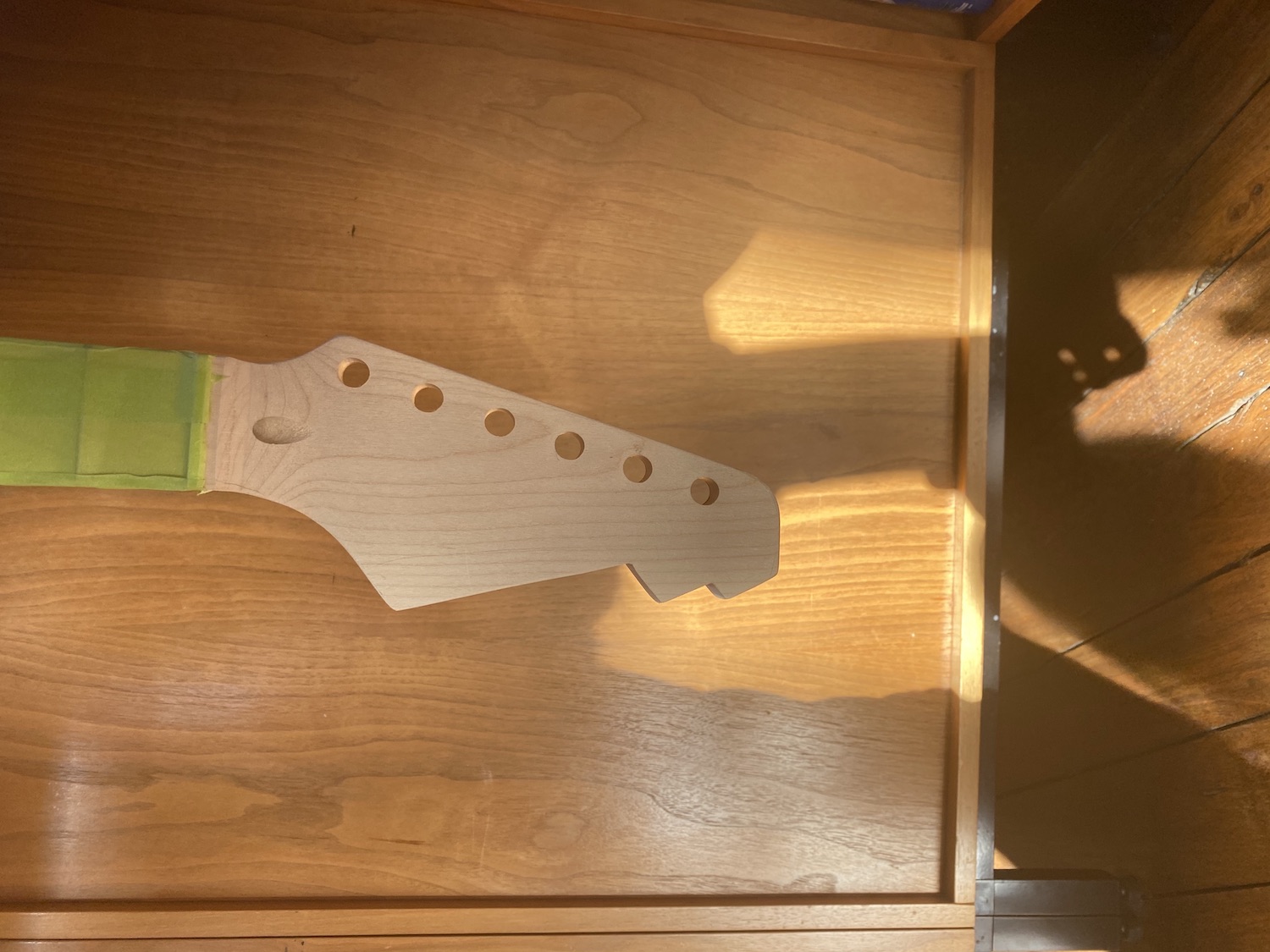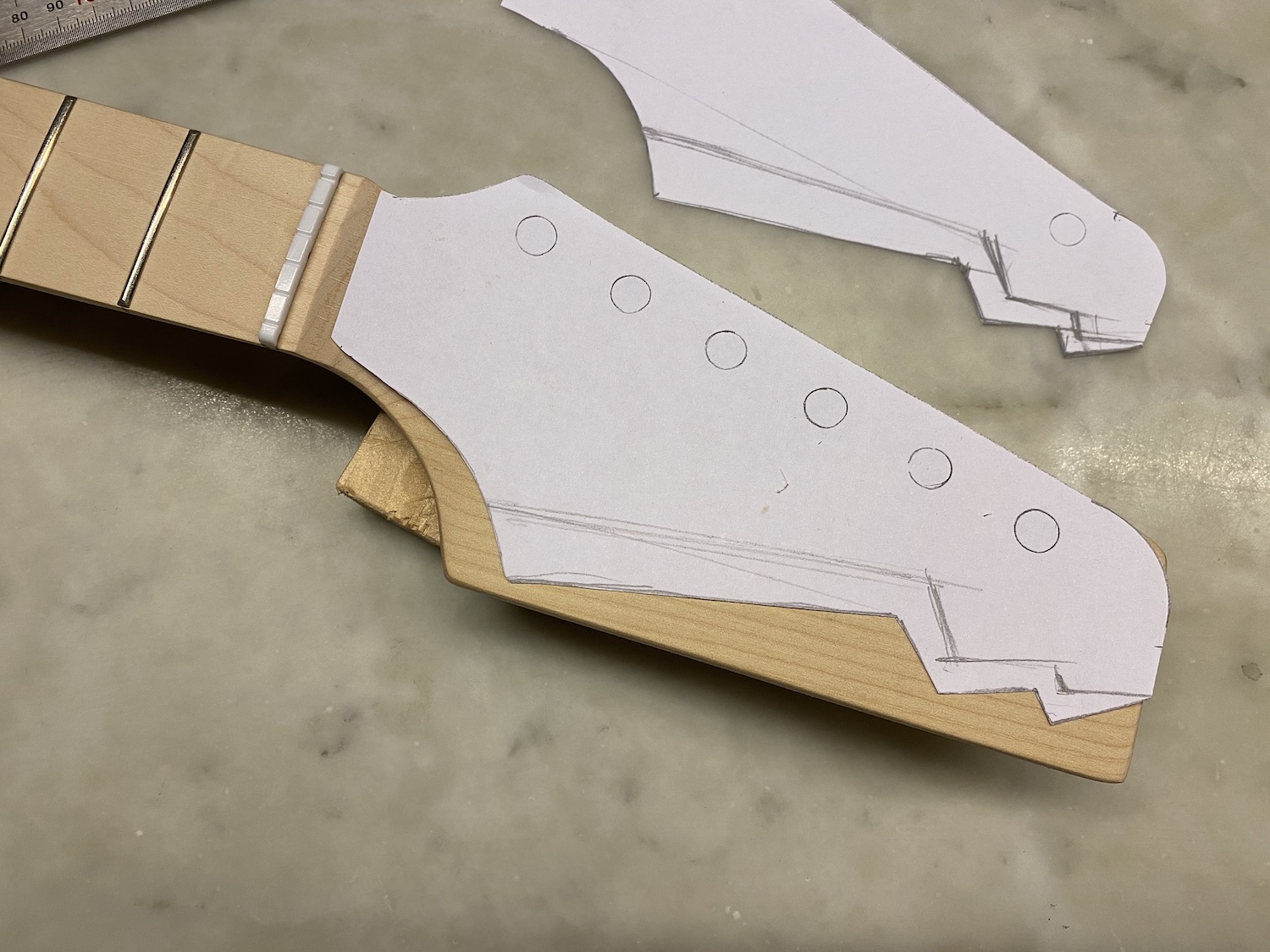 Headstock and end of the fretboard got some roughing in treatment today, ready for the lightning bolts that need to be incorporated into the finish.