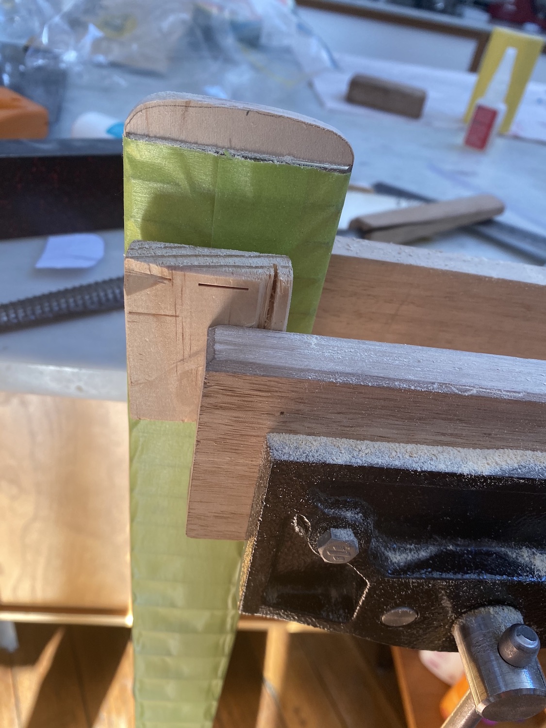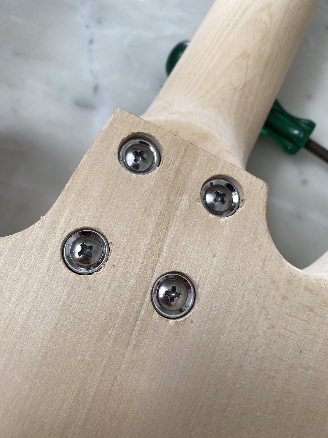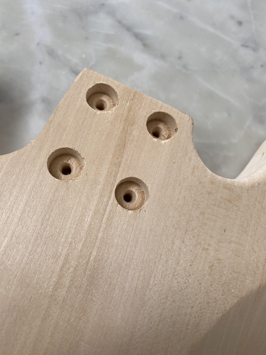 b) basswood is SUPER soft... lots of compression in the neck ferrules. I used the drill press to bore out the existing screw holes, using the depth stop for consistency, but they must have compressed another 3mm into the back of the body at tension! All good, tight neck achieved