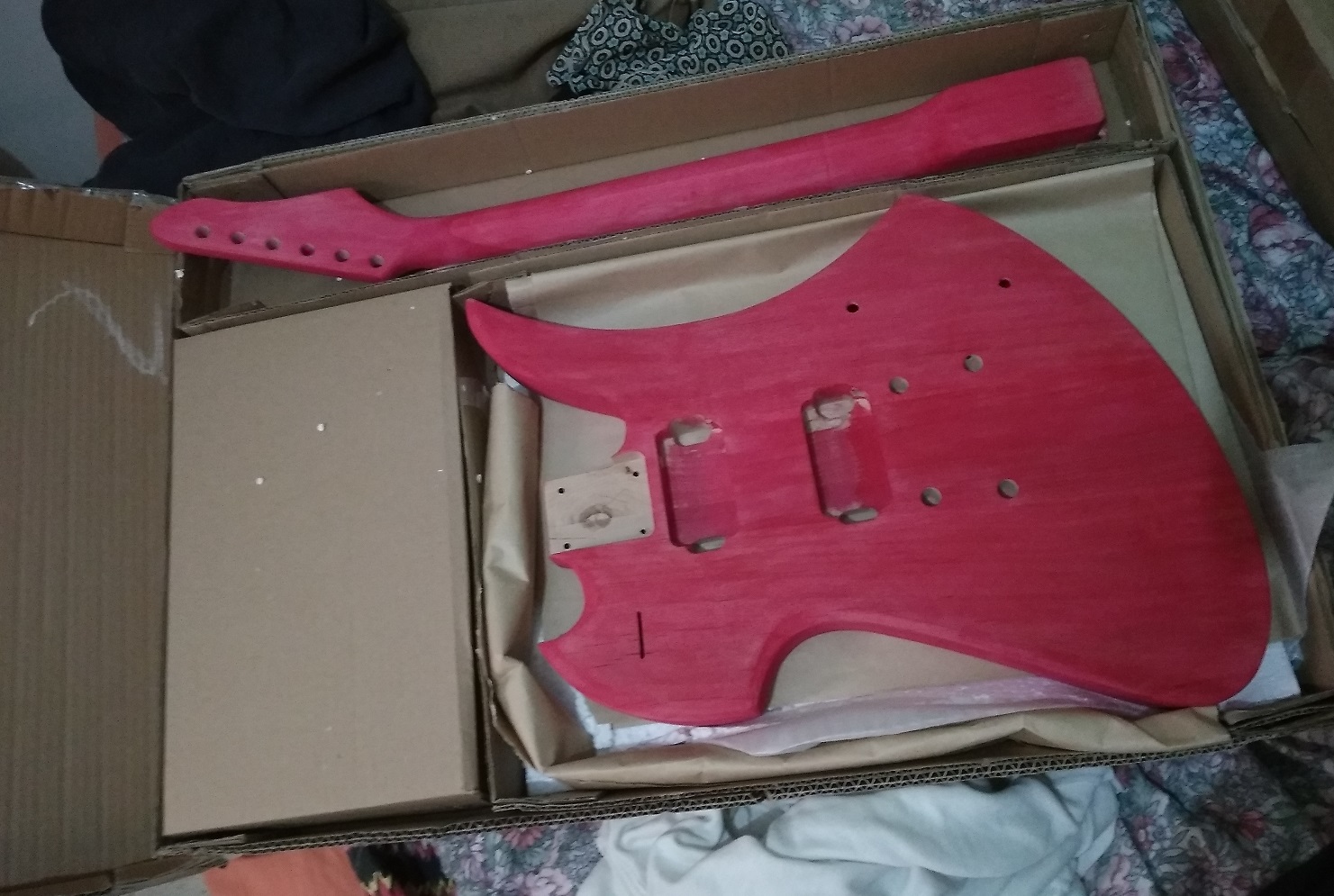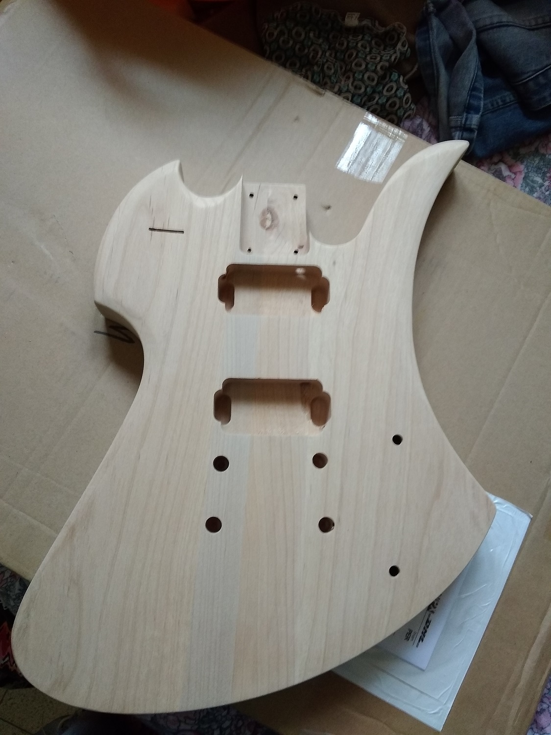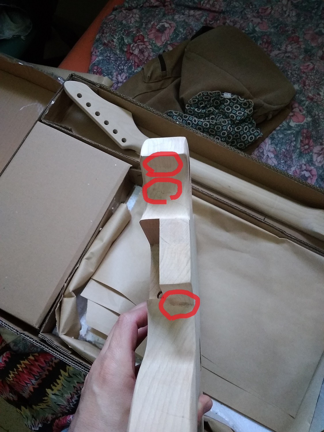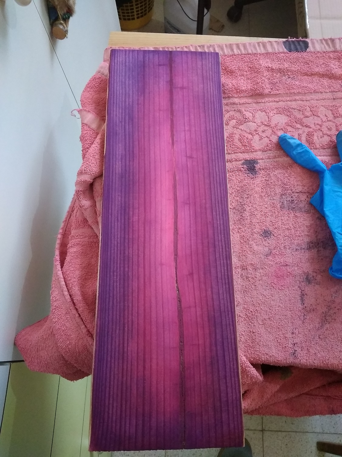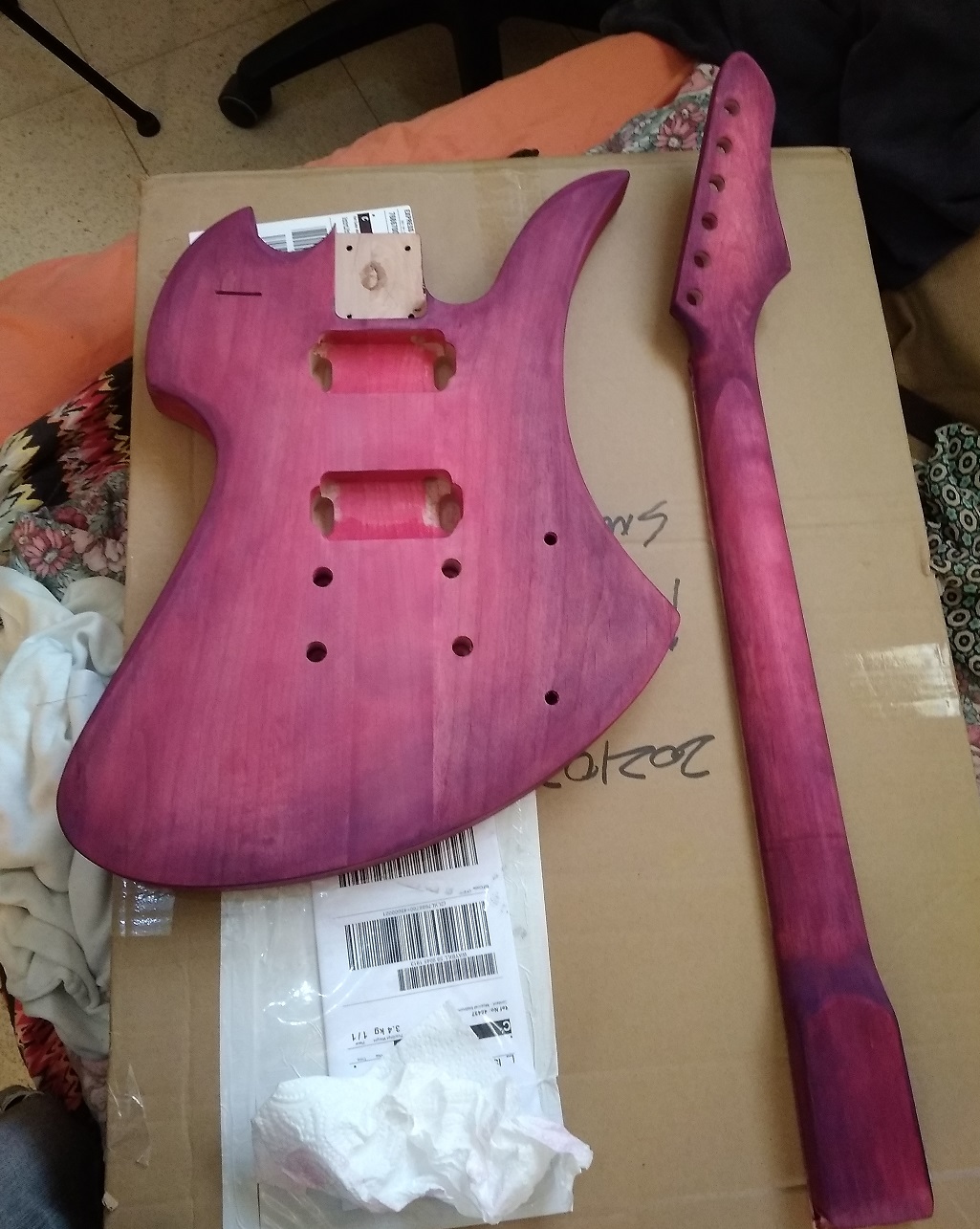 If the marks are glue marks, they'll come up a lot lighter than the body if you rub the body down with turps, methylated spirit or white spirit, If they are natural marks, they'll show up dark. If natural, you'll have to decide whether you can live with them, or want to cover them up. It's unlikely you could get a dye that's dark enough to fully hide the marks, which is why I suggested a paint spray.