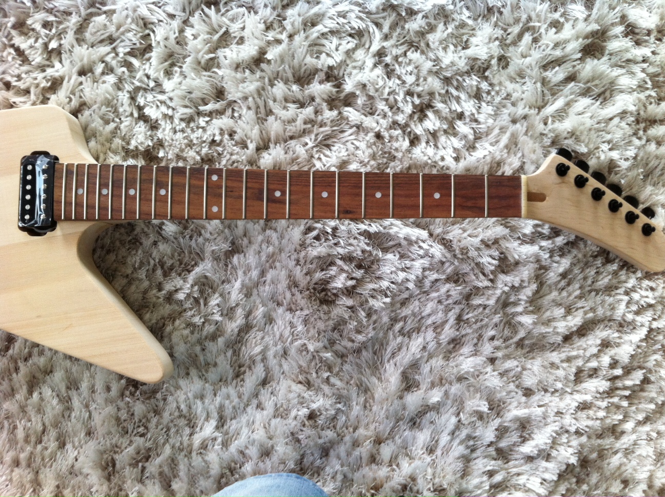 On this one I spent a bit more time and money contemplating what I wanted and ended up modding it with Tonerider Alnico 4's, Burns 500k push pull pots, 0.47 orange tone cap, volume resistor/cap, DB Neck & Bone nut job. After experimenting with Dingo Tone Outback Sunset & Coolangatta Gold brew on the EX-5 will keep this one simple and do just Coolangatta Gold. Happy with the grain on all sides of the body as well as on the neck and fretboard. Thought the headstock would be more pointy like on the EX-5 however this one is a bit more stumpy but still looks ok. This now gives me something else to work on whilst waiting for DT coats to cure on the Bass and before I start the hardware and wire part of the set up.