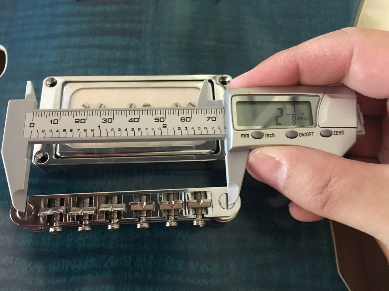 When I use my (cheap) calipers I'm getting 72.70mm or 2.86inch 2 55/64inch. Not seeing those numbers match up with any of the Tune-o-matics on StewMac.