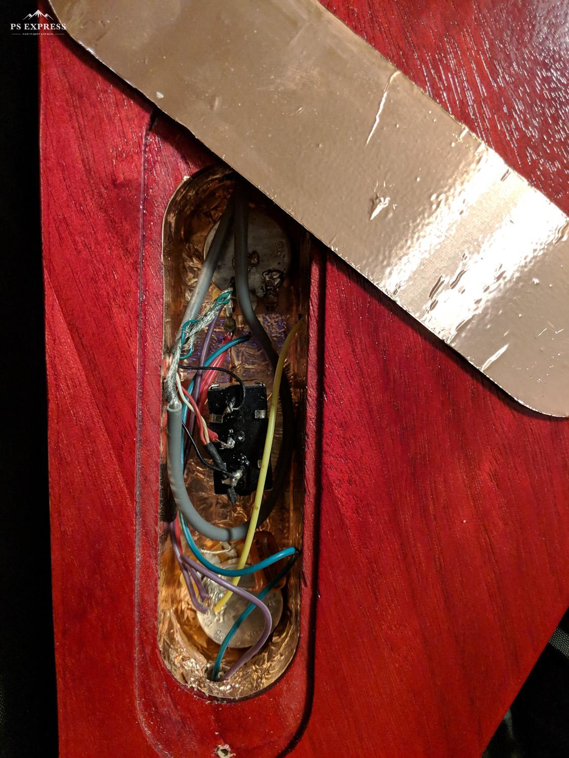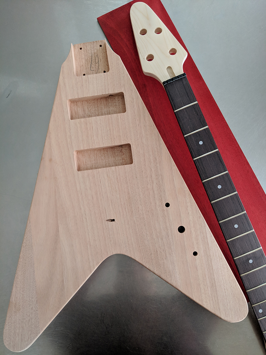 I'll be upgrading the pots, switch and jack. The jack has a radius to it for a rounded body, not flat like the wing of a V. Not sure about the pickups yet. I'll test them first, but will likely go with ceramic humbuckers like the ones in my old Thunderbird.
