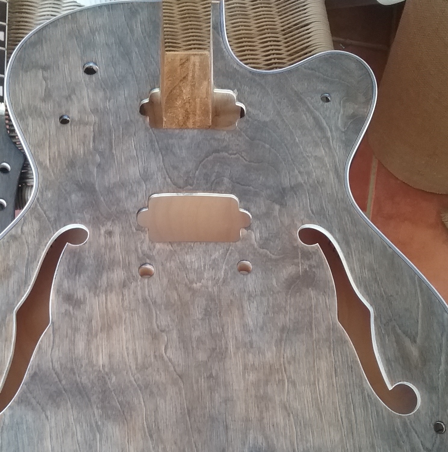 Photos #10 and #11 show vastly inconsistent stain absorption around the heel and neck/headstock join. I'm not concerned. I think it'll add to the character and individuality of the guitar in the end.