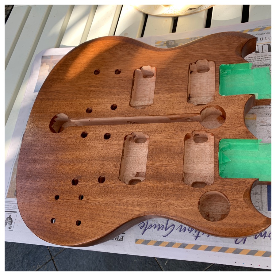 I've sanded and stained the body with a Walnut stain, also cut a wave in the headstock and stained the neck walnut also.