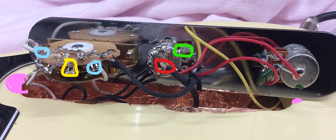 I was worried I’d put the switch in wrong wayarround. The red circle is where the original blue wire was but I figured I would use a continuous wire from the 4 connector wire right through to the pot rather than stopping at the end of the switch and then using another wire to connect switch to pot.