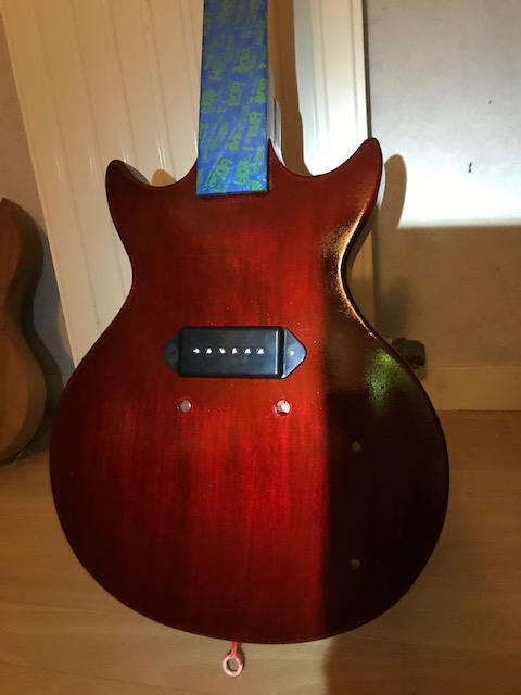 i like the vintage look of dark mahogany , so i think i will put a nitro finish , then try to make it krakle with a light relic . relic the p90 too.