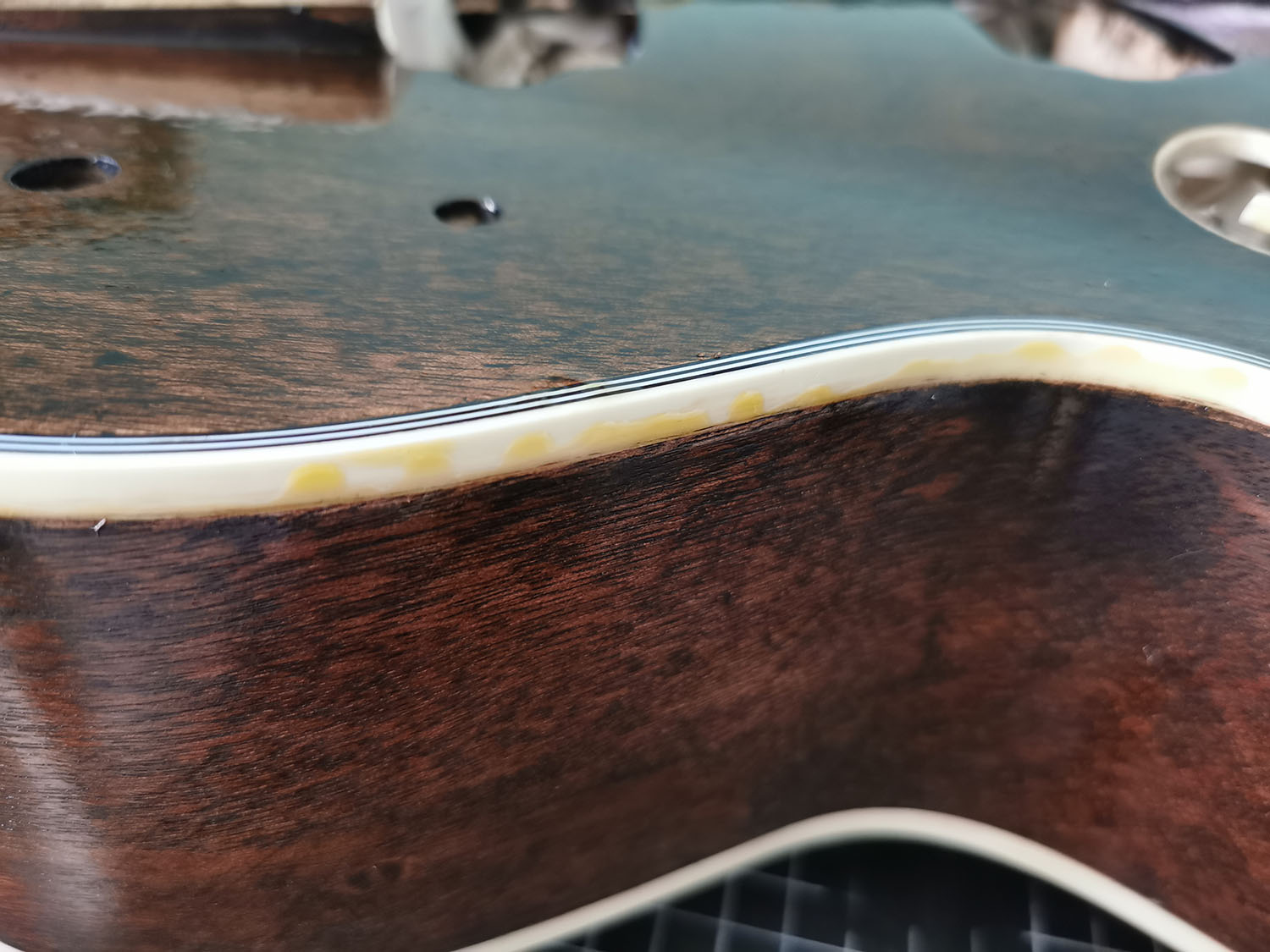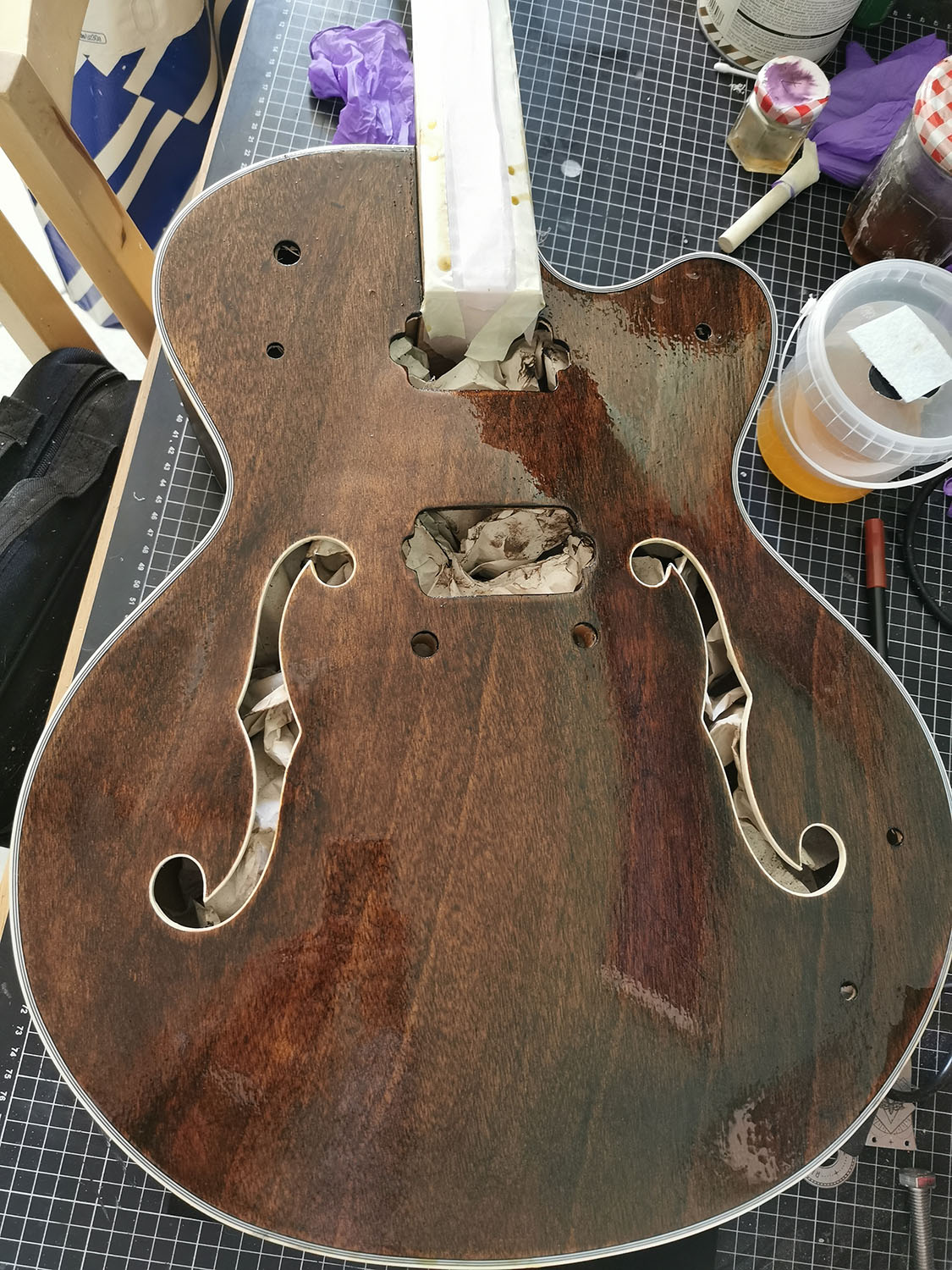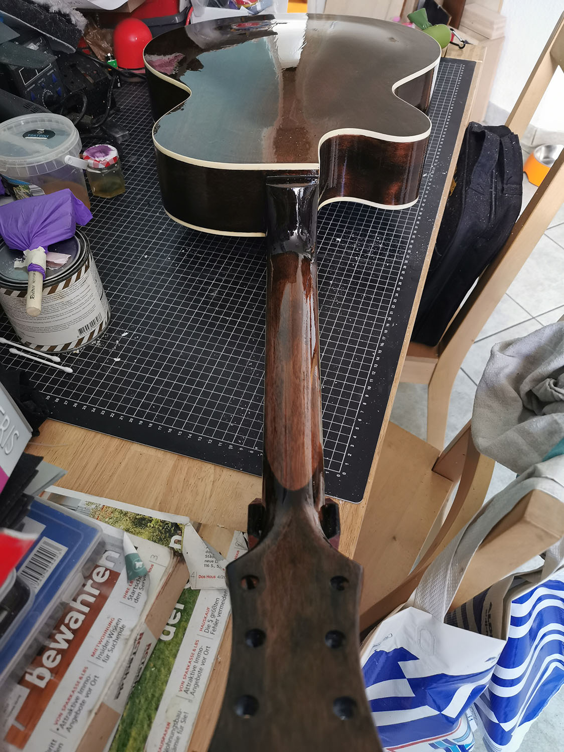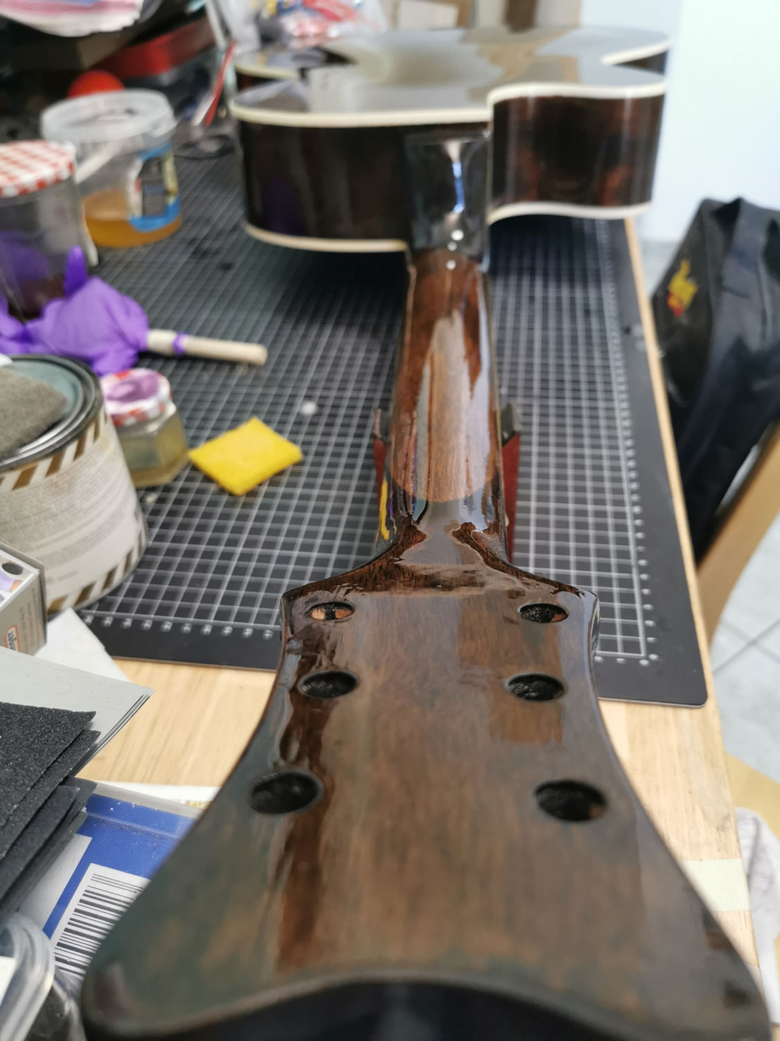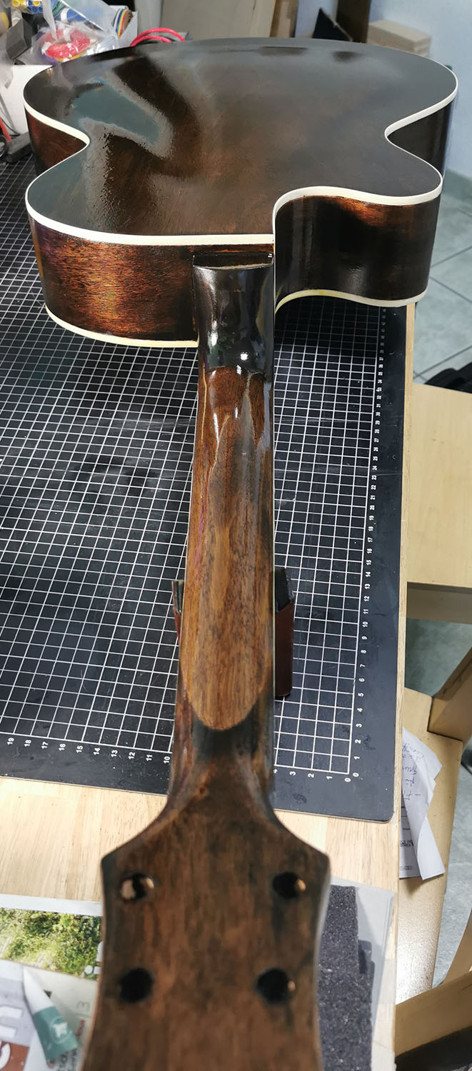 As the body and neck were already very smooth, I didn't have to do much so far. Lightly sanded it with 400 grid, filled and steamed a few spots, removed the nut and test fitted the neck.