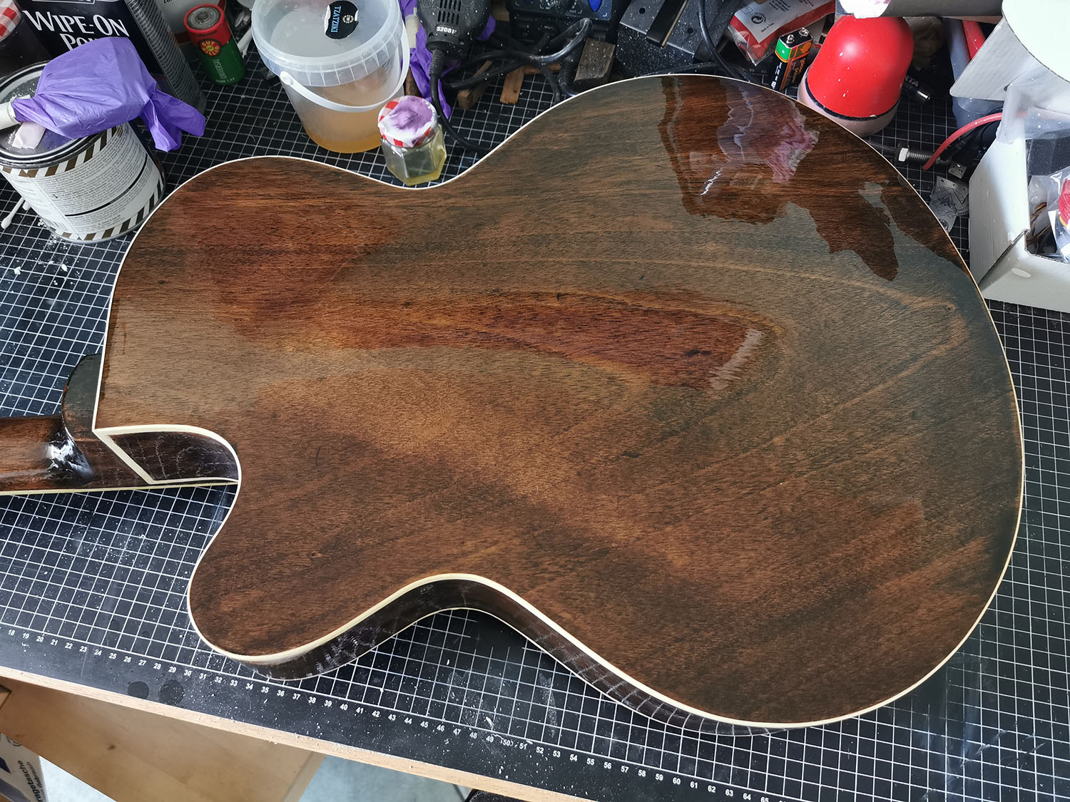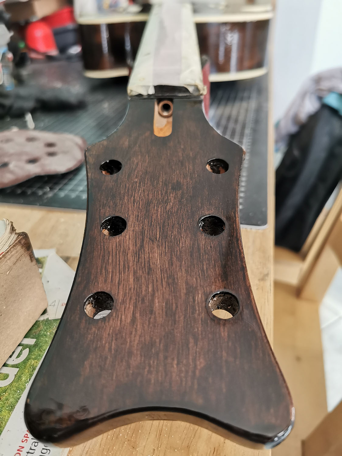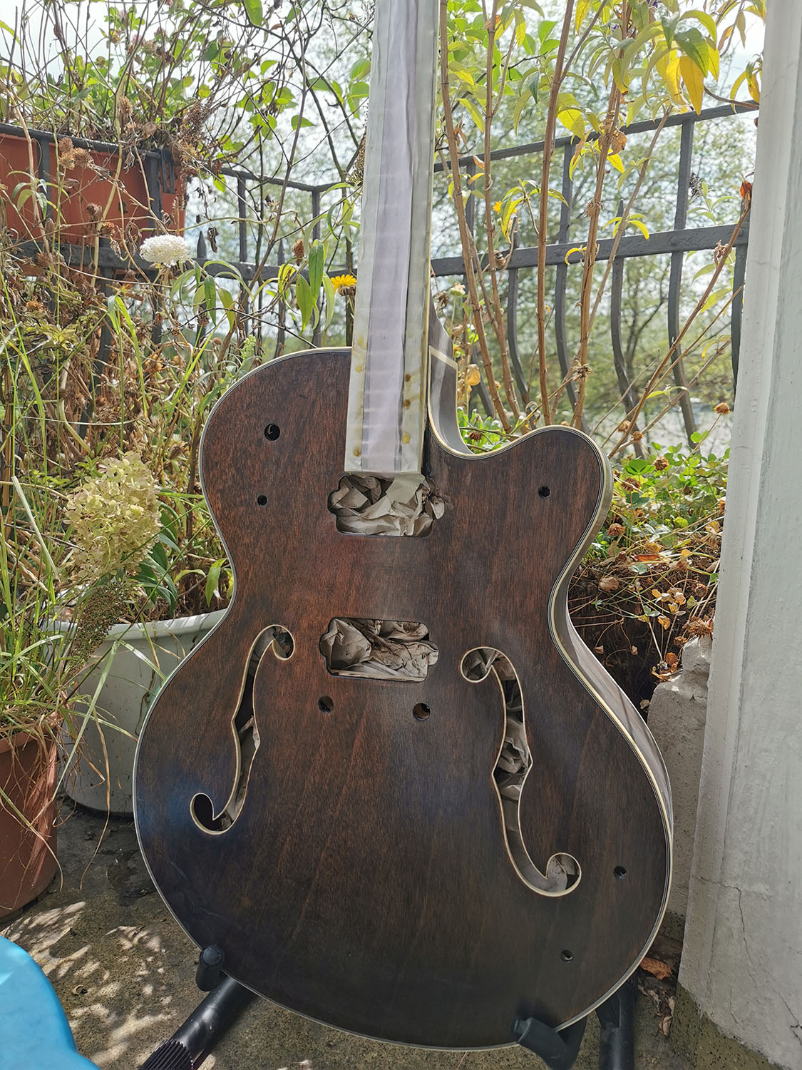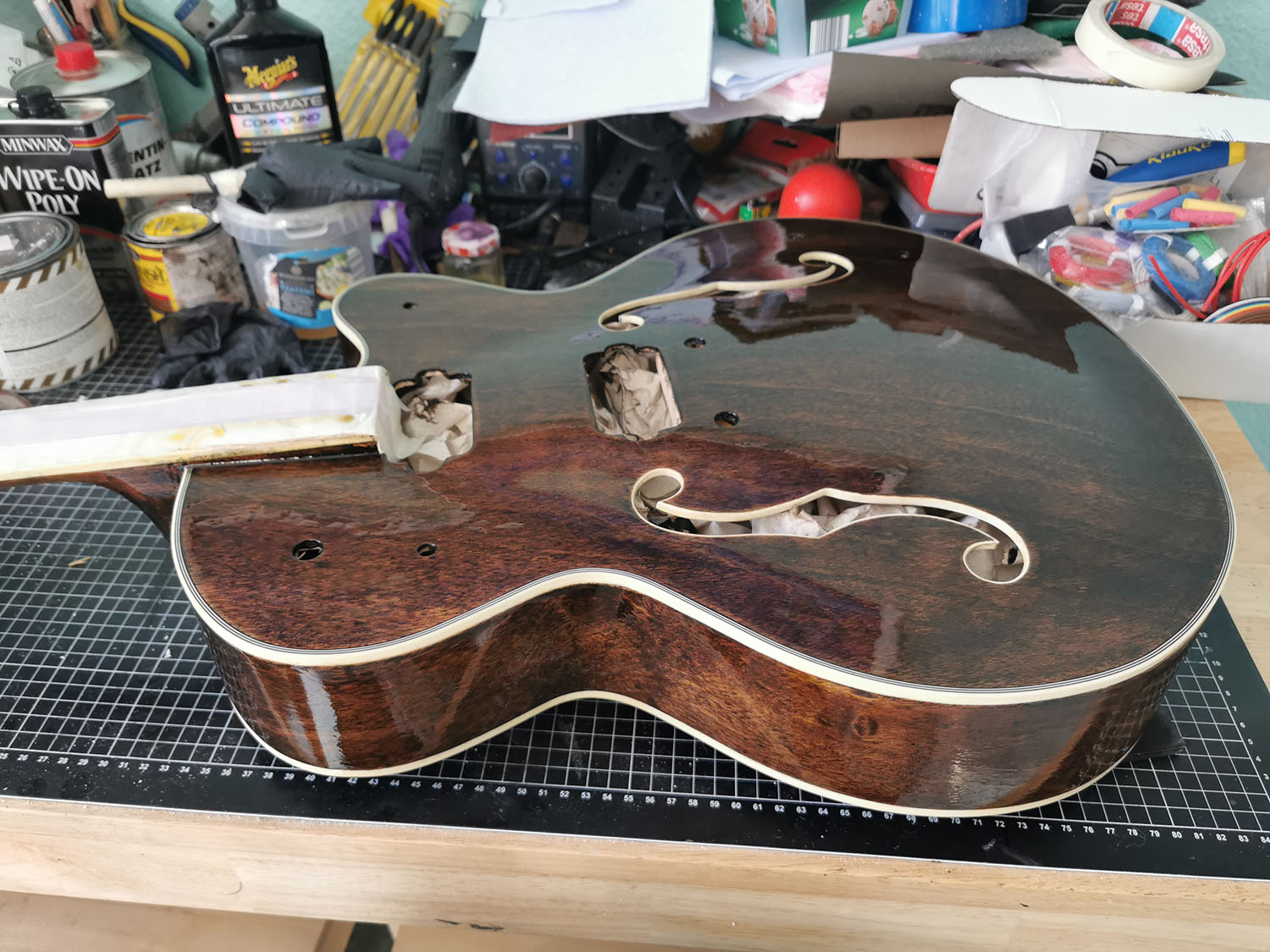 As the body and neck were already very smooth, I didn't have to do much so far. Lightly sanded it with 400 grid, filled and steamed a few spots, removed the nut and test fitted the neck.