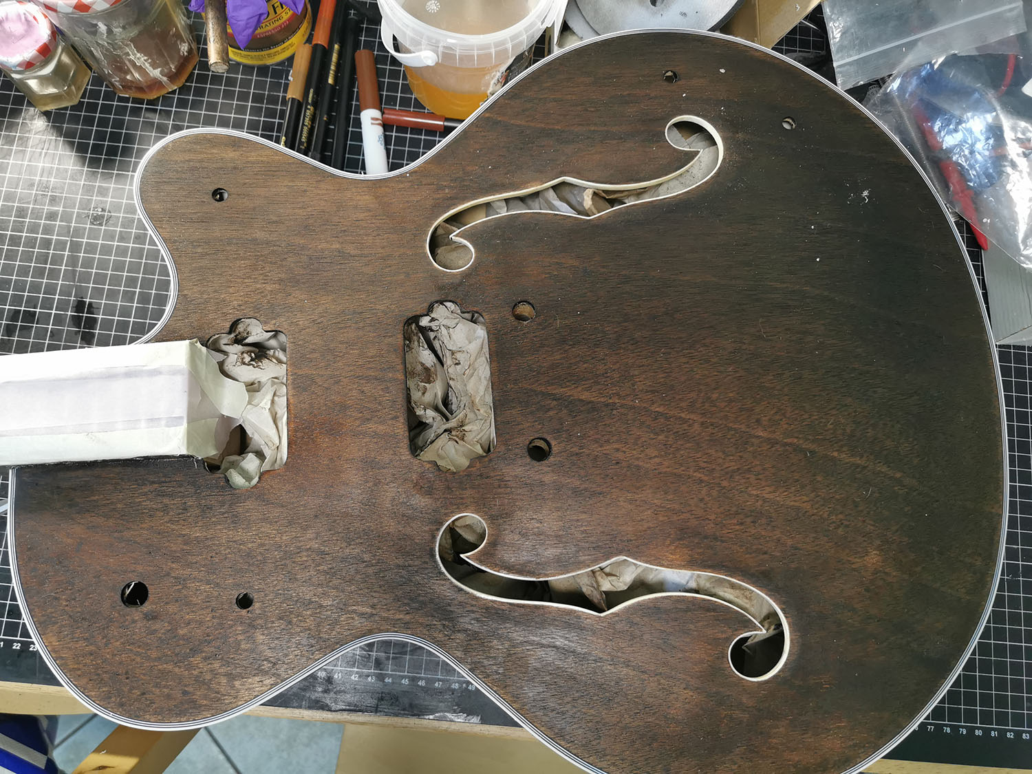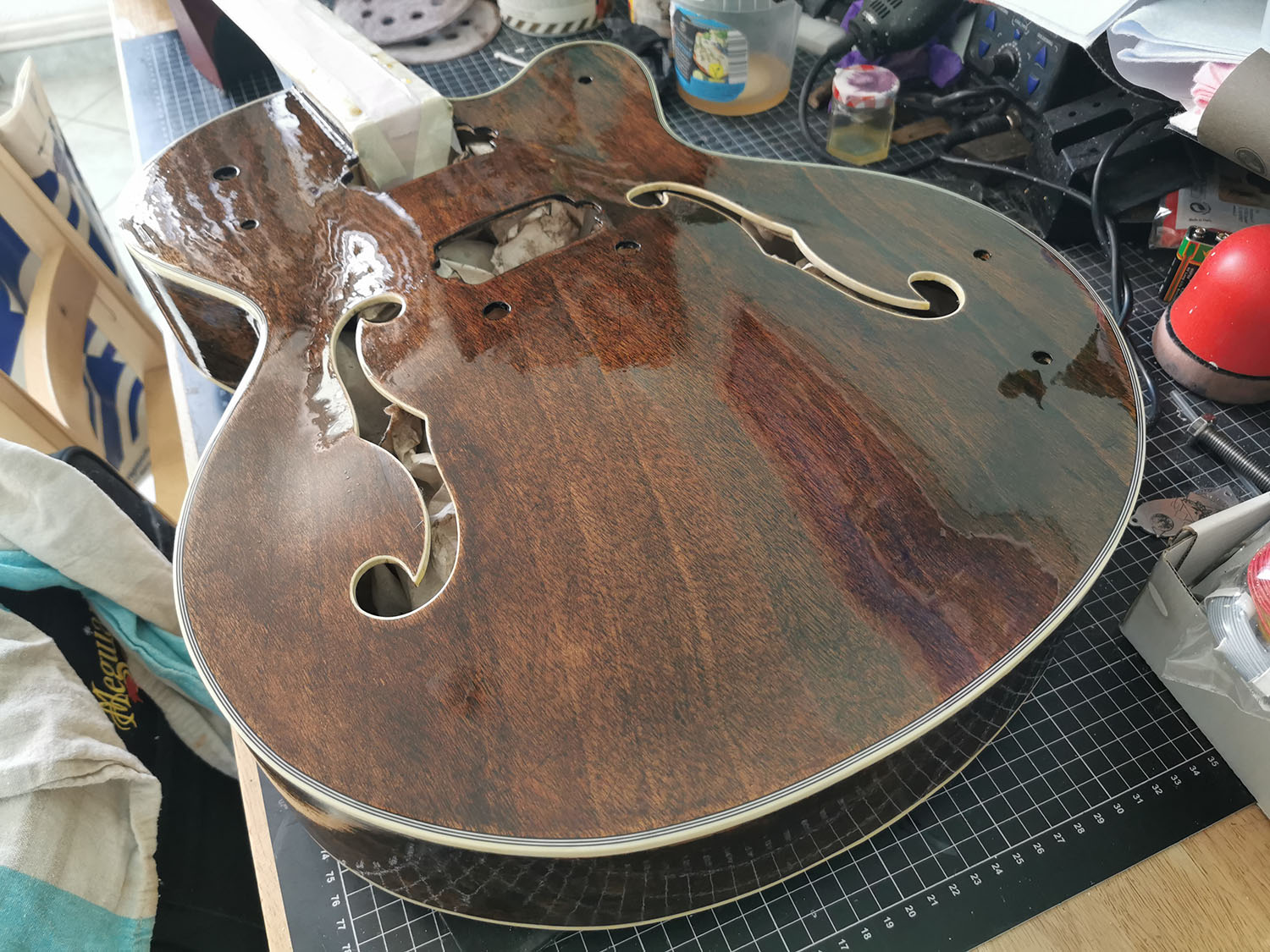 The kit itself looks really nice, had a few tiny dings that I steamed out with a moist cloth and a soldering iron. A few tiny spots needed filling, but most were around the neck pocket and get covered anyway. No glue stains so far. I *think* one of the pickup routes is slightly off, but I think it won't be too obvious when finished. At least this is what I hope :D