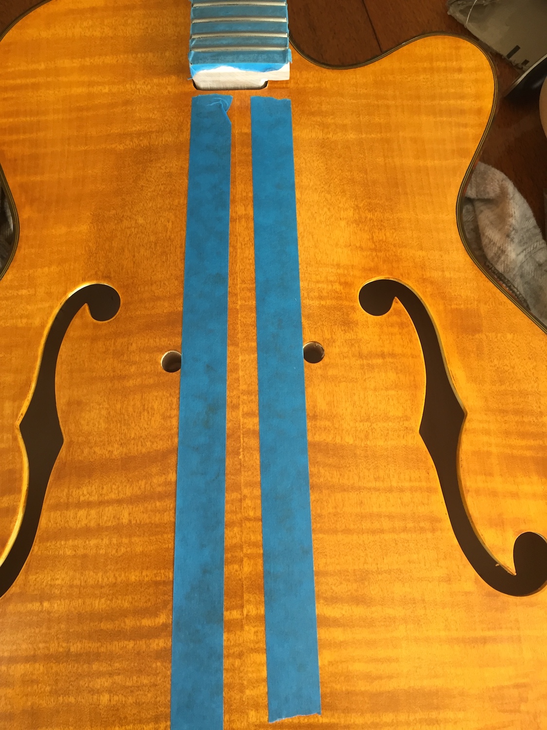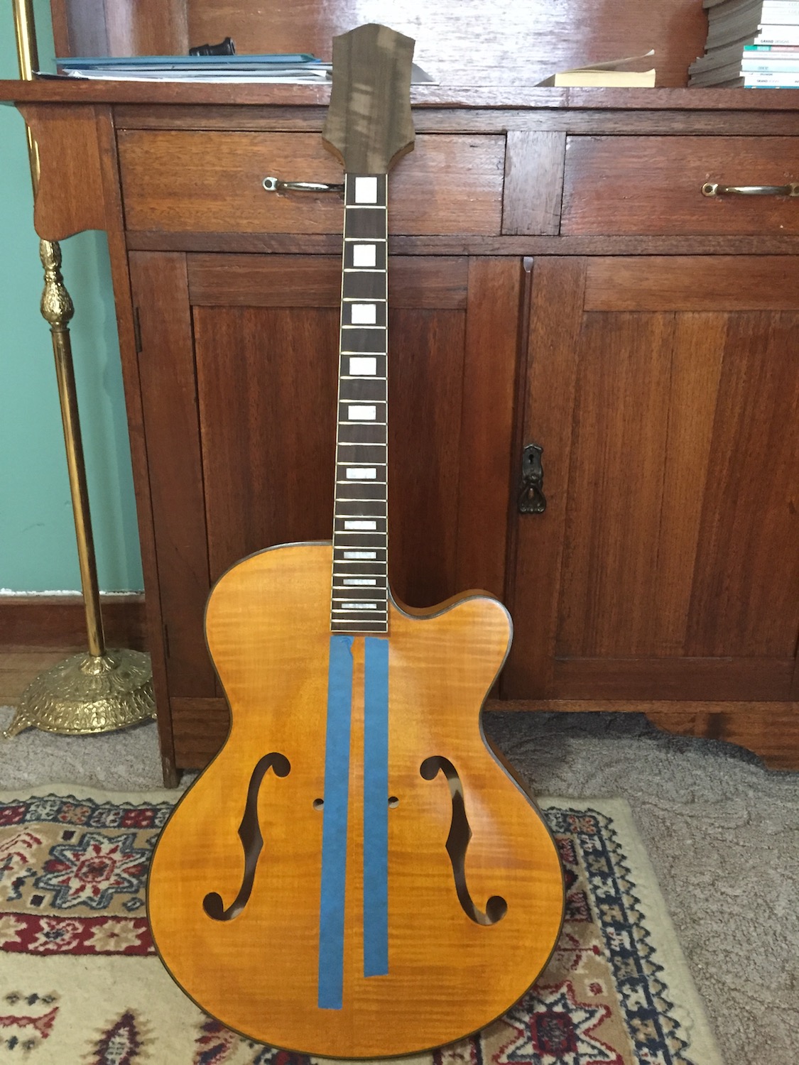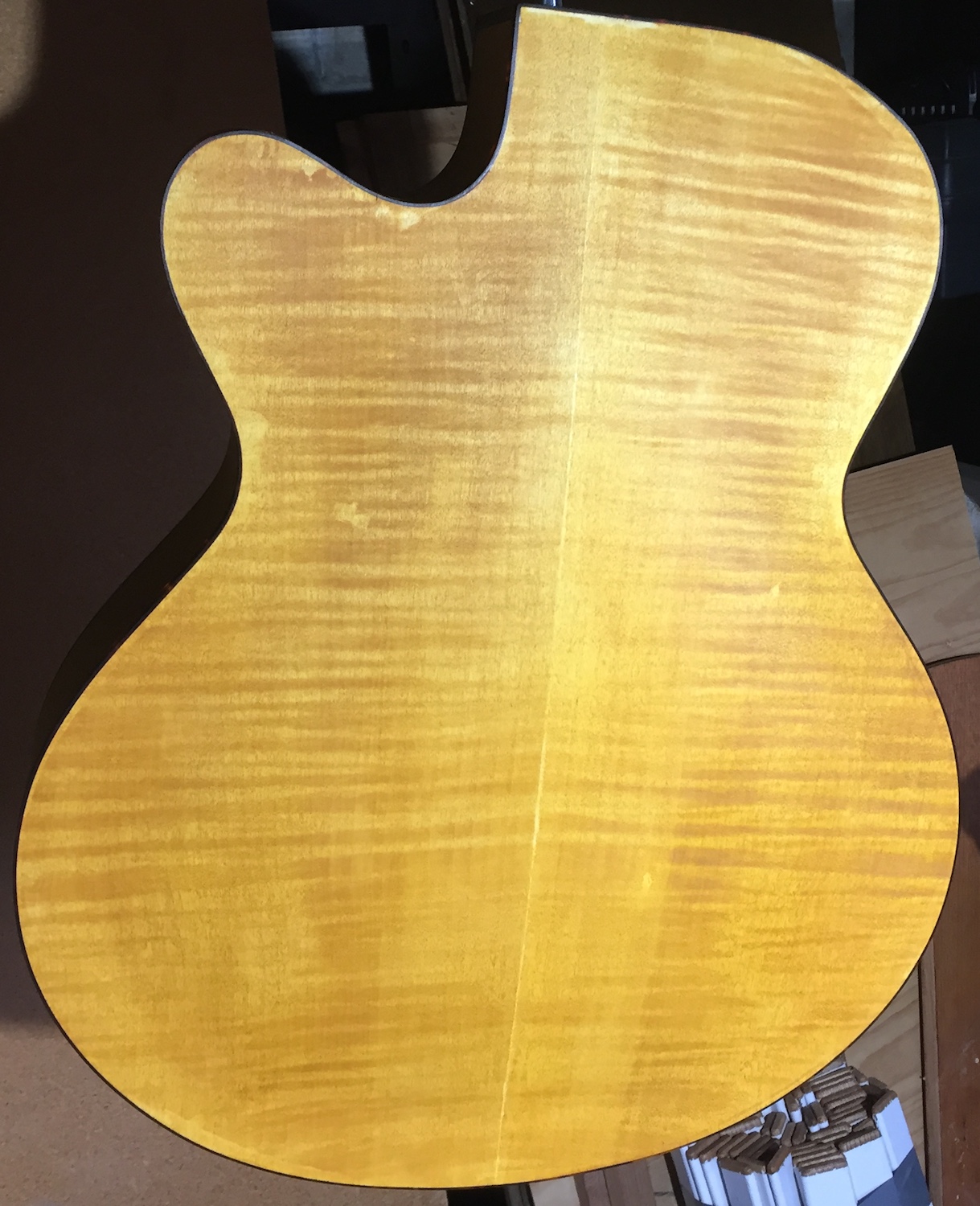 I'll post some pics in the comments (as supplied by Ben) of the body supplied by the factory - I wanted flame back and front, and because the Gretsch style build they supply is not the same layout/pickup size, etc, I asked for only bridge post holes and f holes on the top. Now that I notice the f holes are in a bit of an odd position (pretty much all archtops have the bridge positioned central to the f holes), I may or may not live with this one as the f hole positions in relation to the bridge get to me....