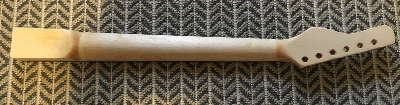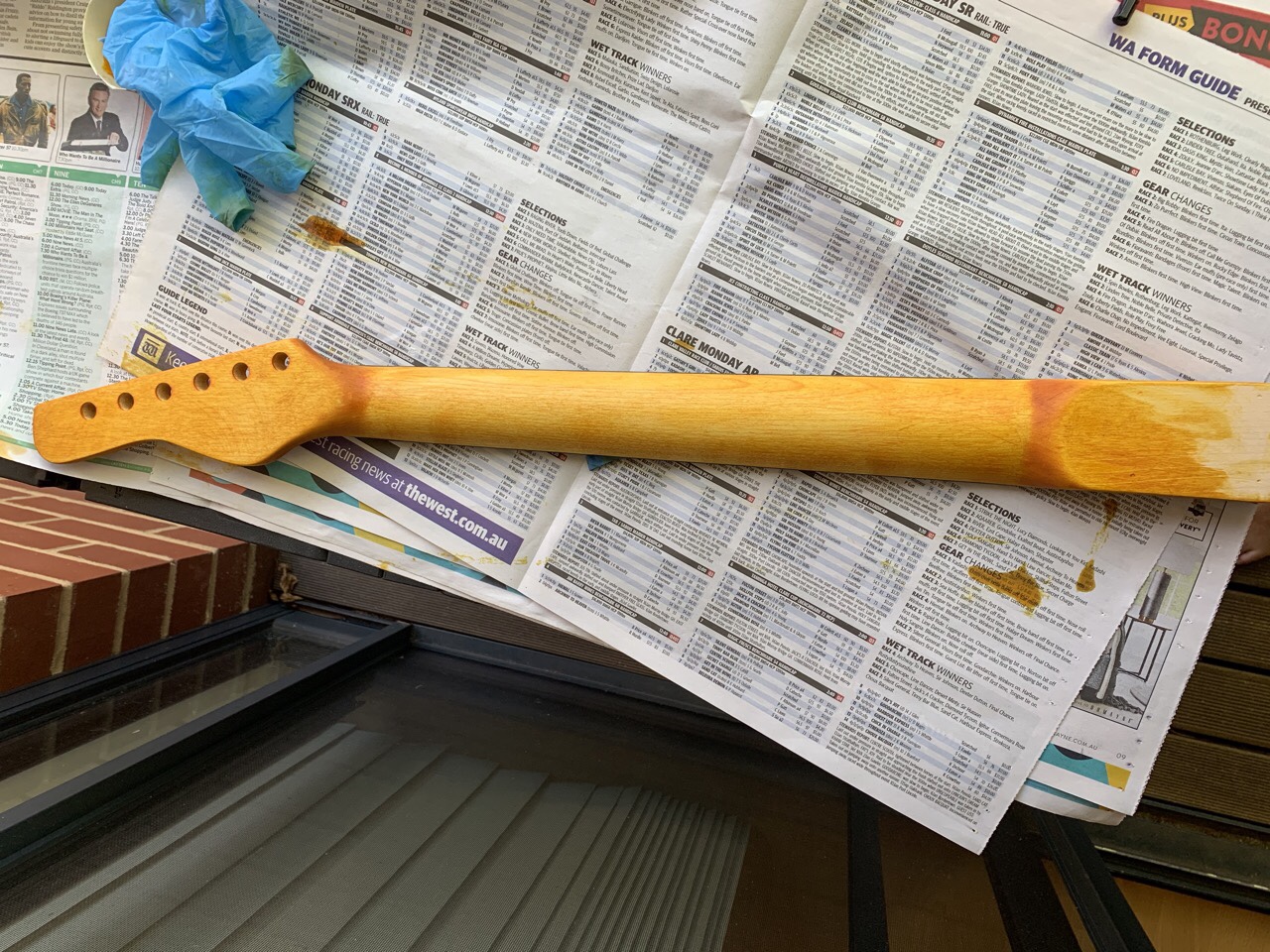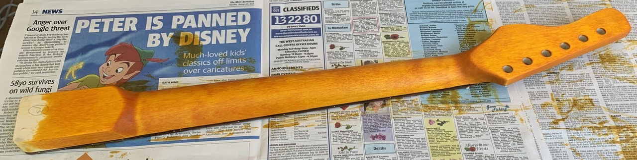 Once I finished that process, I decided it was time to restain the neck, with my now preferred Goolangatta Gold stain from Dingobass.