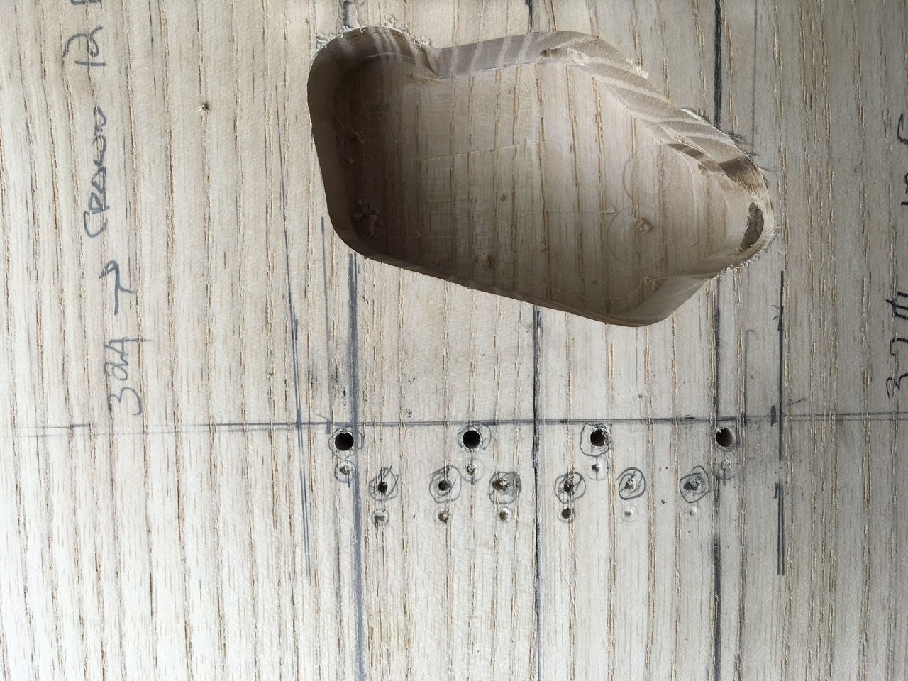 Next step is to drill out the 6 holes on the 20 mm side of the jig to the string ferrule width and hand drill the body again, starting from the outside (then using thicker dowels to secure the jig) and drill out all ferrules.