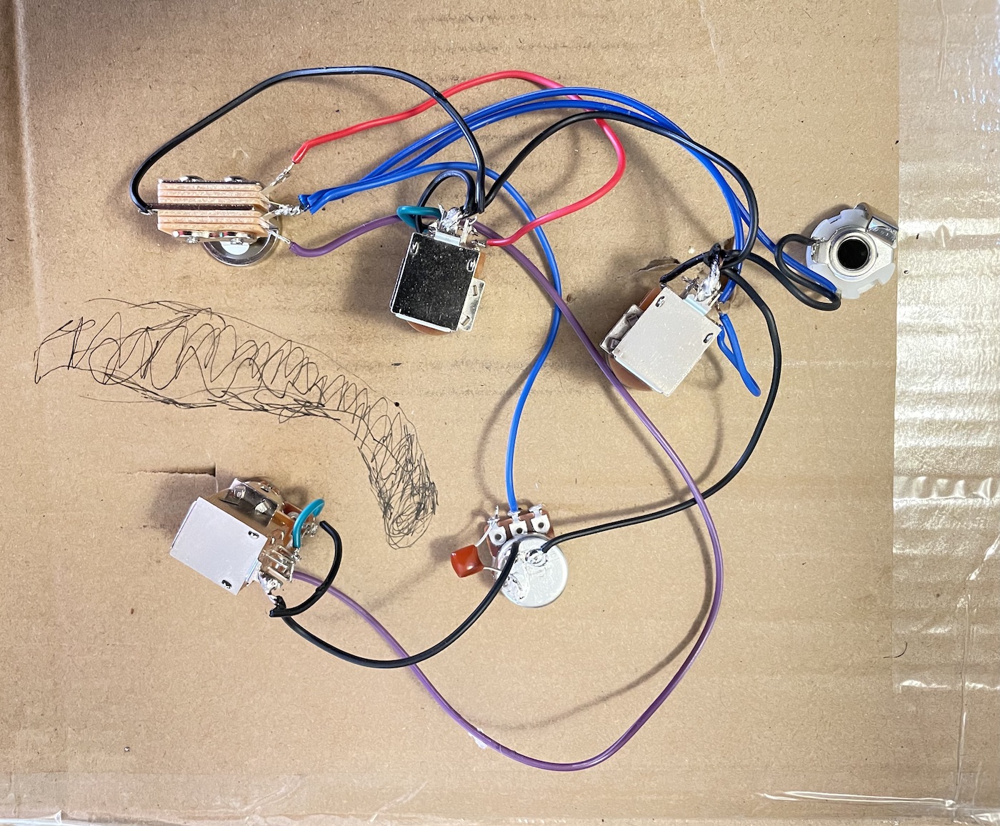 - The ability to run the piezo on its own. This does not work. The classic wiring on the humbuckers is also taking the piezo to zero when one of the humbucker volumes is taken to zero. I had thought that putting the piezo on the middle lug of the switch would solve that, but it doesn't seem to have worked that way.