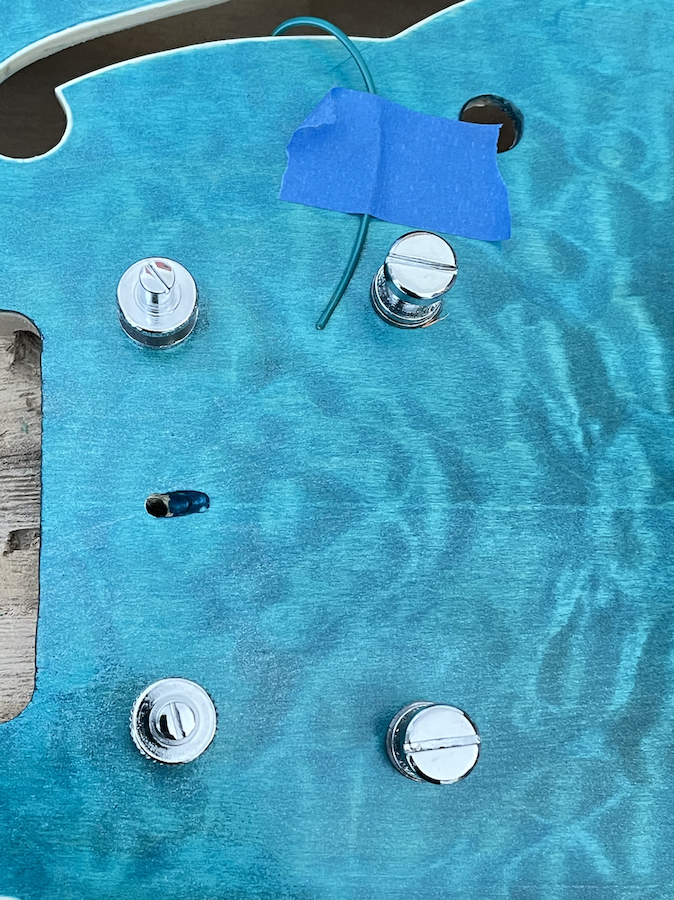 But beware of using them on a fully hollow body guitar for the bridge. On my ES-3, where the kit neck angle is definitely far too shallow, the block under the bridge isn't very deep, and when I drilled it the holes out to a size and depth to make stud insert easy for my straight sided inserts (which were longer than the kit inserts), I went right through the block. There's only a very thin skin of wood between the standard kit hole depth and the other side of the block, so without the T-top to help provide support, downward pressure is likely to push the straight-sided studs out of the bottom over time. So in the end I didn't use the straight sided inserts on the ES-3 but had a go at insetting the T-top a bit. (I need to have another go to improve this).