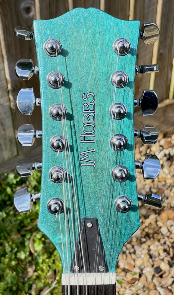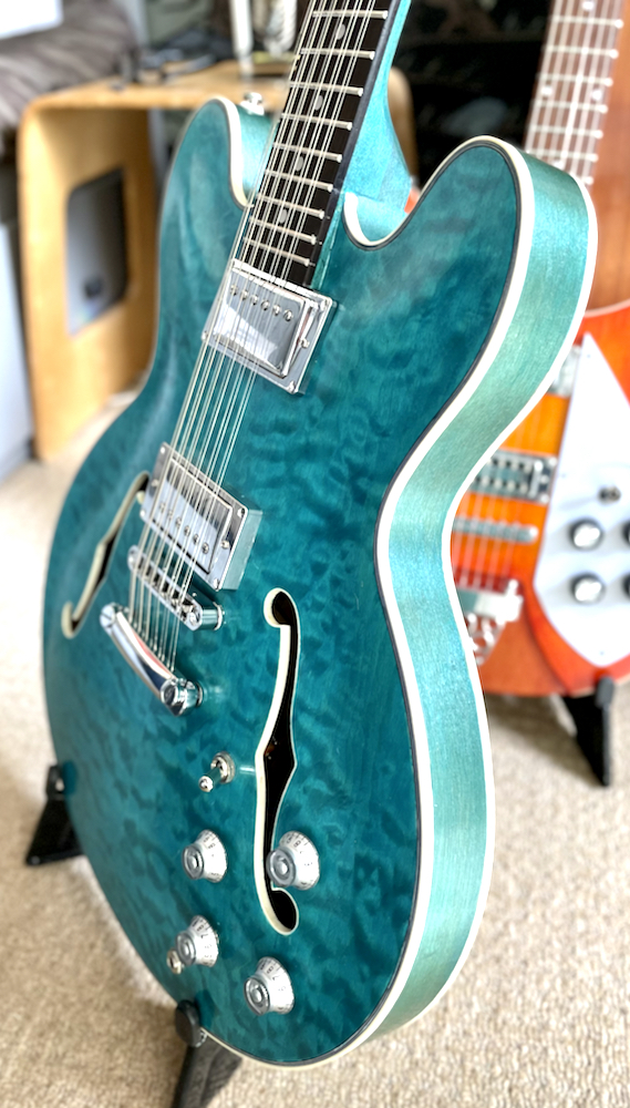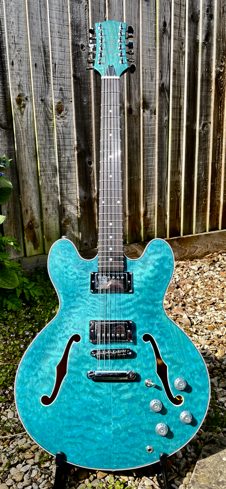 Electric semi-hollowbody 12 string. My second kit from PitBull. The quality is really good - better than I expected. Although it was advertised with a basswood body, it's actually mahogany, the neck as well.