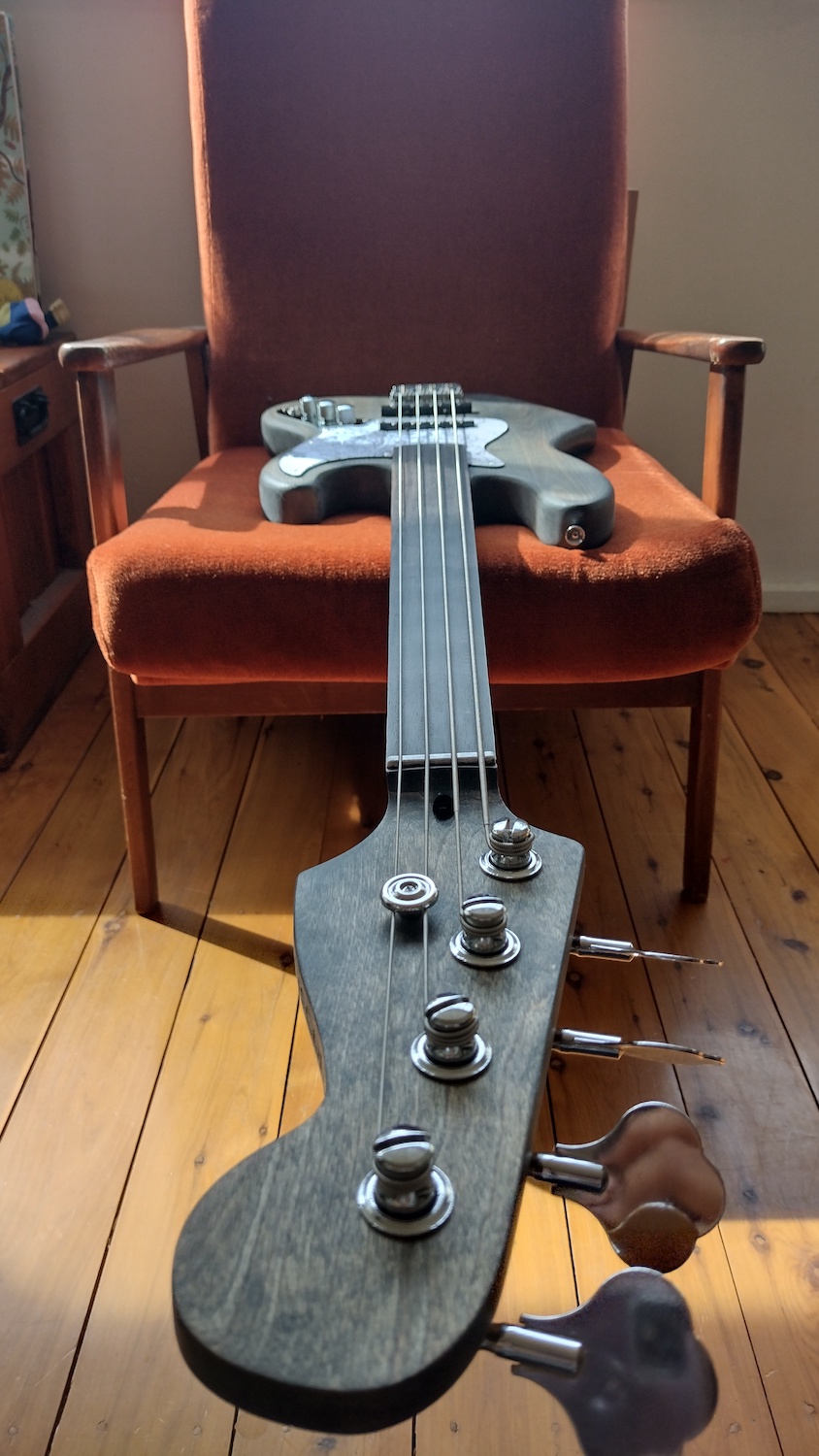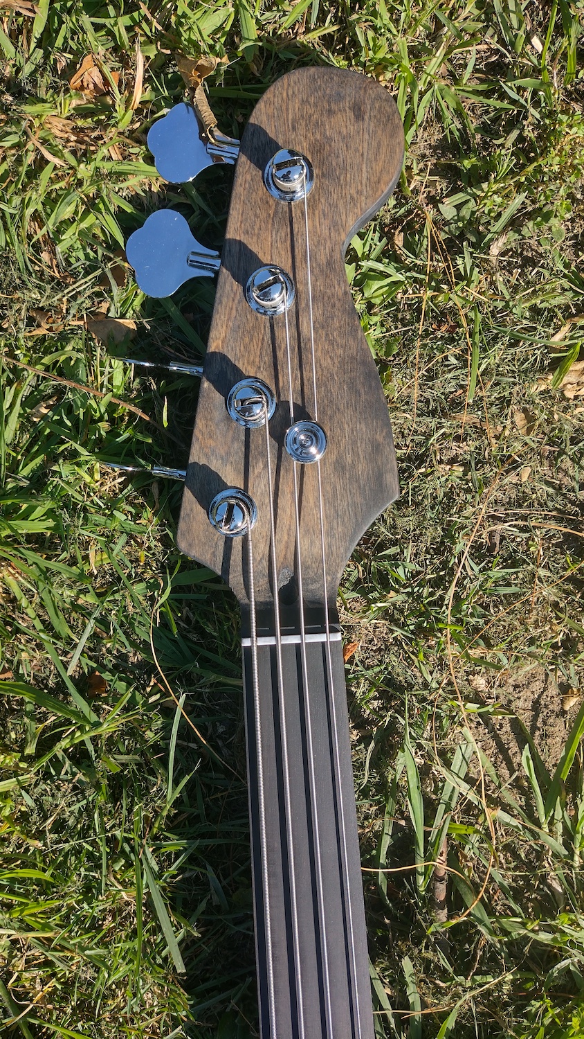 Solid effort for a first build. Love the pick guard design which goes well with overall colour scheme. DT Black Stump can be a challenging product to use and it looks like you went with a grain fill satin finish appearance which is a very traditional bass appearance. Engraved logo on underside of headstock is a great unique touch. Well done.