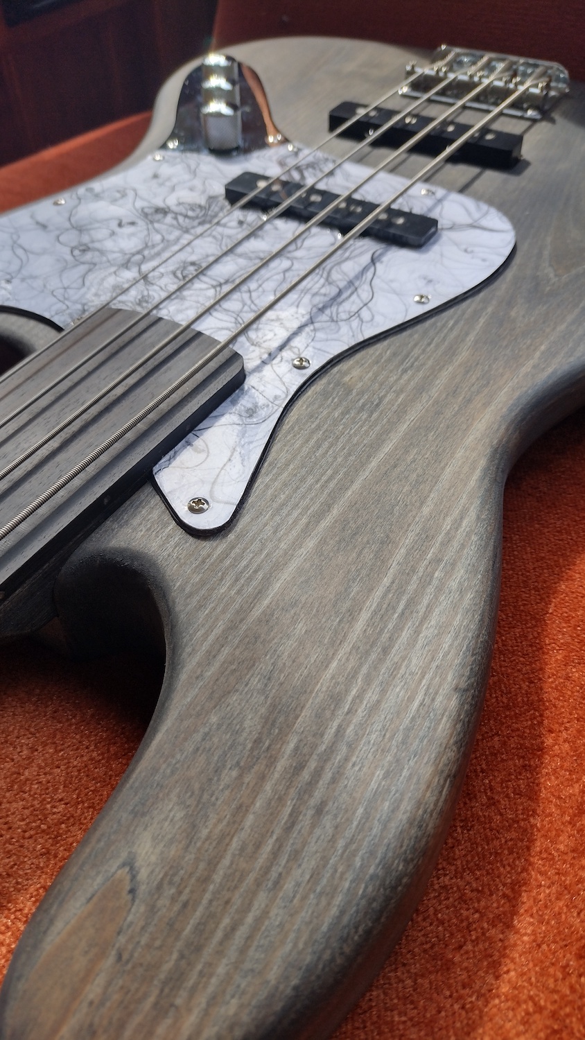 When I see this I think 'driftwood', and I love it. Some really interesting choices and great execution. The effect of the finish on body and neck look great, and work well with the fretless board. Fantastic pickguard. A really appealing look bass.