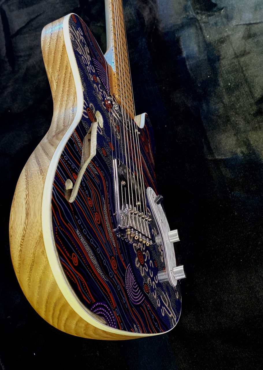 Hi everyone. During a 08 month tour in Australia I purchased a TL-1 without accessories. I wanted to make a fabric top with an aboriginal fabric i found in Sidney. Back home in Seattle I pushed the theme further by carving the head-stock in the shape of a kangaroo footprint, a boomerang control plate and an aboriginal symbol on the back.