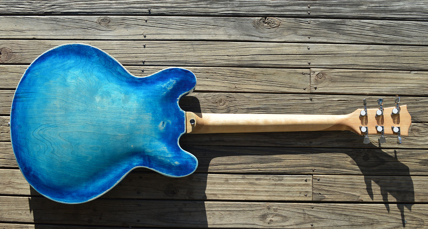 The whole thing was brush painted. I mixed Phalo blue acrylic paint with the Cabothane clear to create a transparent blue fade on the back, a bit like old blue jearns: