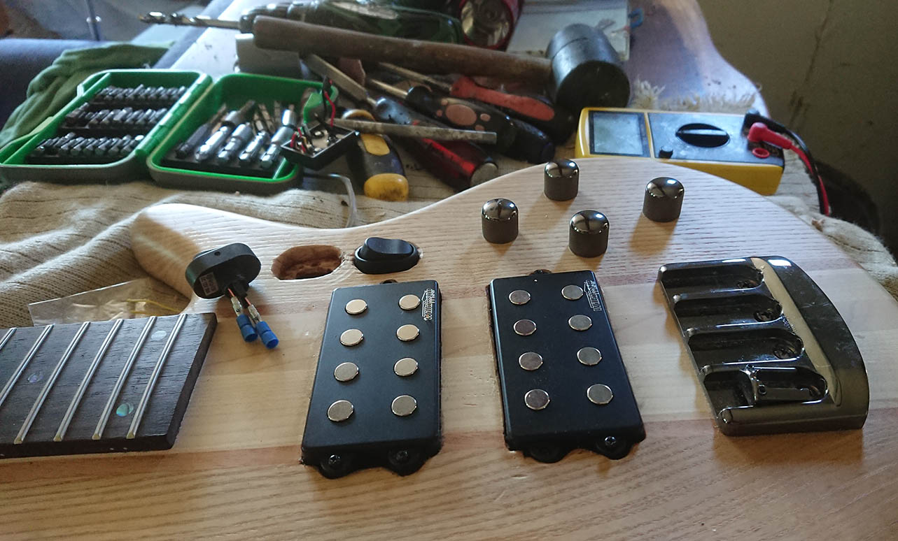 Pic below during installation of the coil-split switches. Bit of chiselling was required to cram those massive pickups into the cheap-ass Haze bass.
