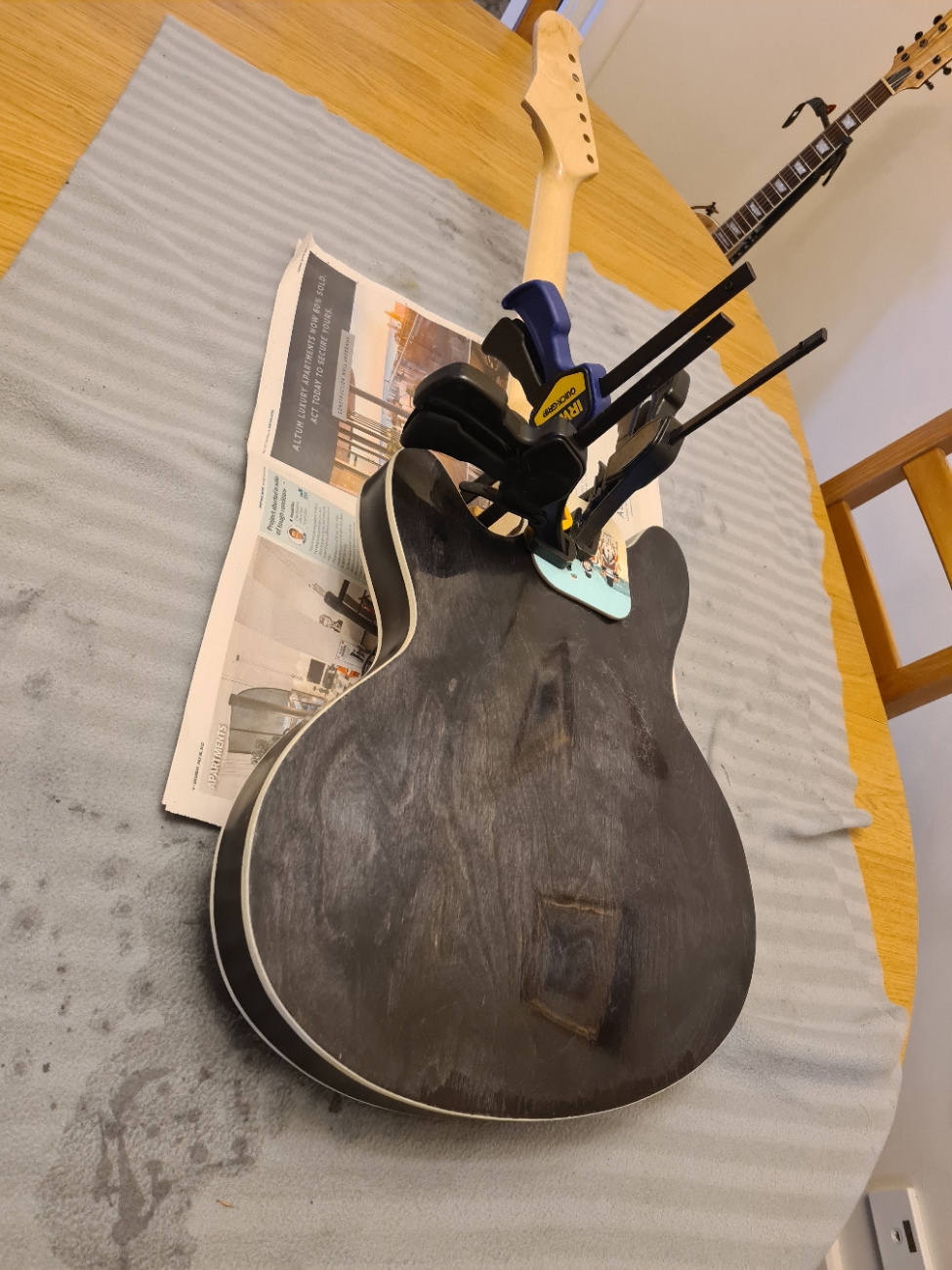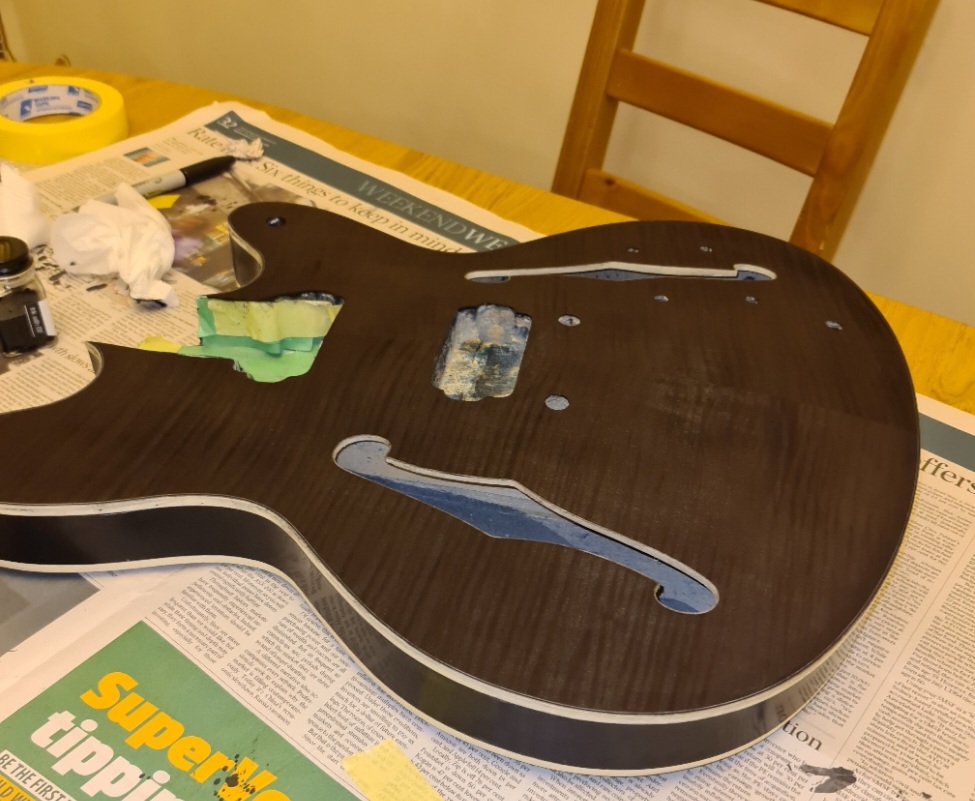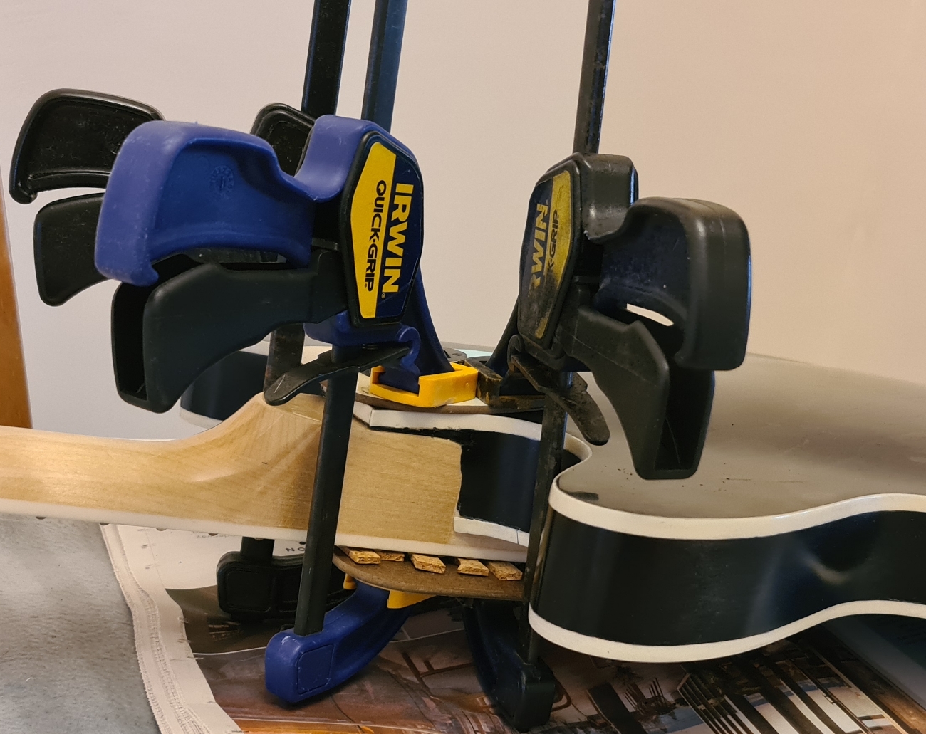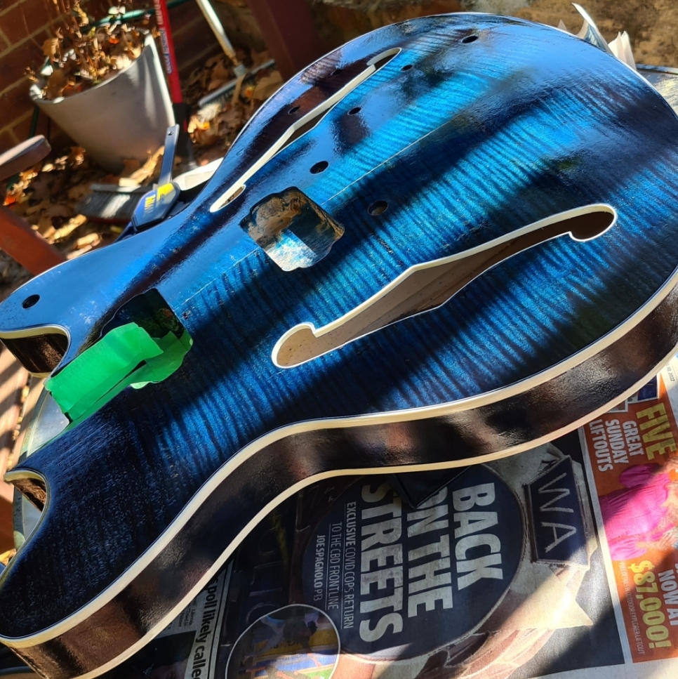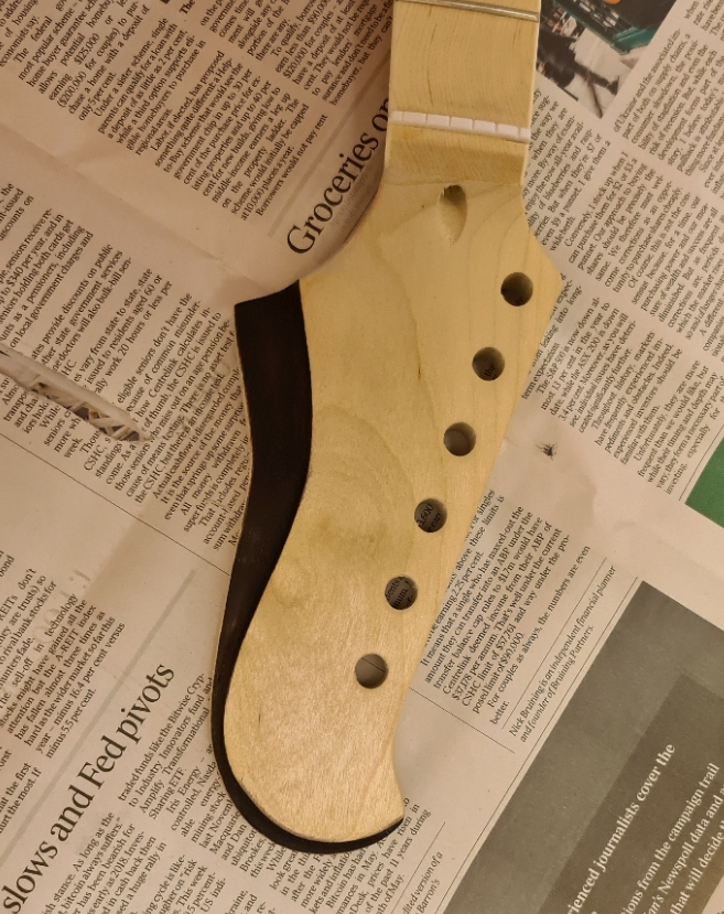 That cork is a very good idea. I had seen someone recommend using some wood to avoid clamping the frets ad the finish - but this will add a whole extra layer of protection. I'm sure I have a cork tile somewhere and I will definitely make up a piece like yours. There is no tennon on the neck of the FS kit - so I will need to be really careful measuring and setting the neck in position. (needed to do that carefully to mask off the neck before finishing - so am part way there).