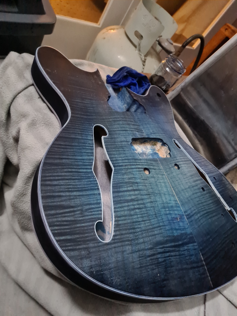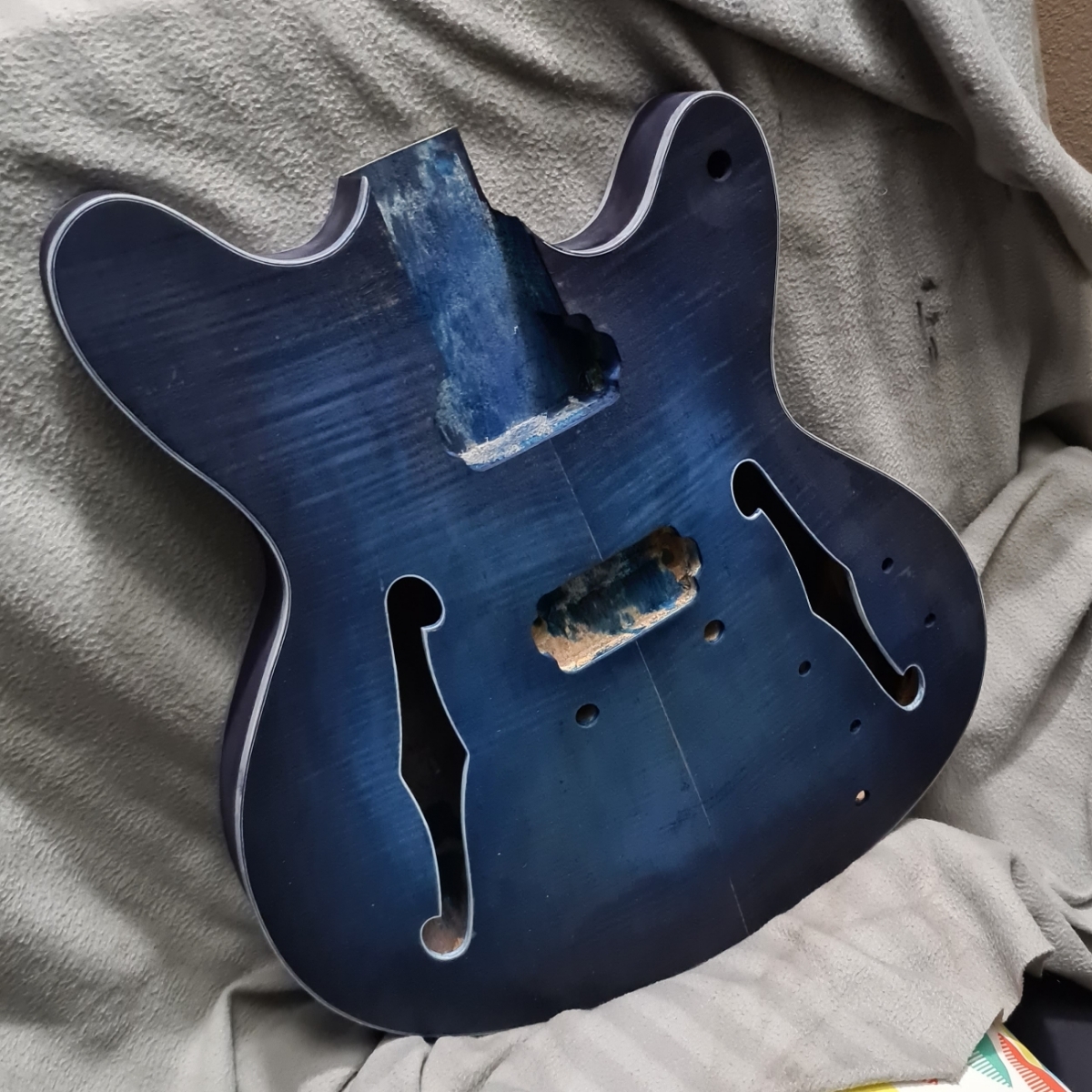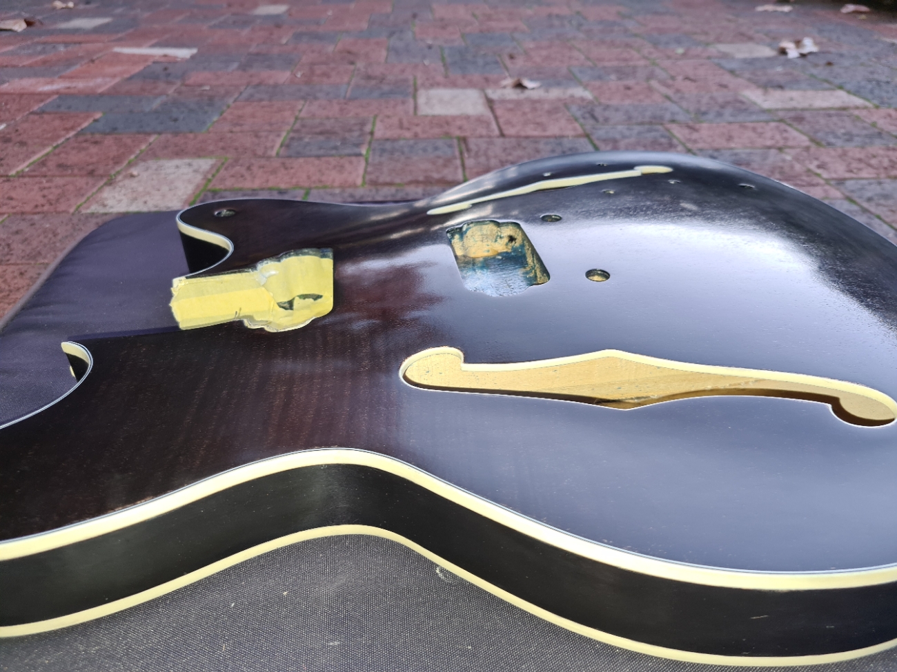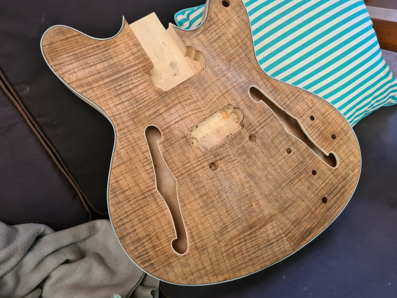 That cork is a very good idea. I had seen someone recommend using some wood to avoid clamping the frets ad the finish - but this will add a whole extra layer of protection. I'm sure I have a cork tile somewhere and I will definitely make up a piece like yours. There is no tennon on the neck of the FS kit - so I will need to be really careful measuring and setting the neck in position. (needed to do that carefully to mask off the neck before finishing - so am part way there).