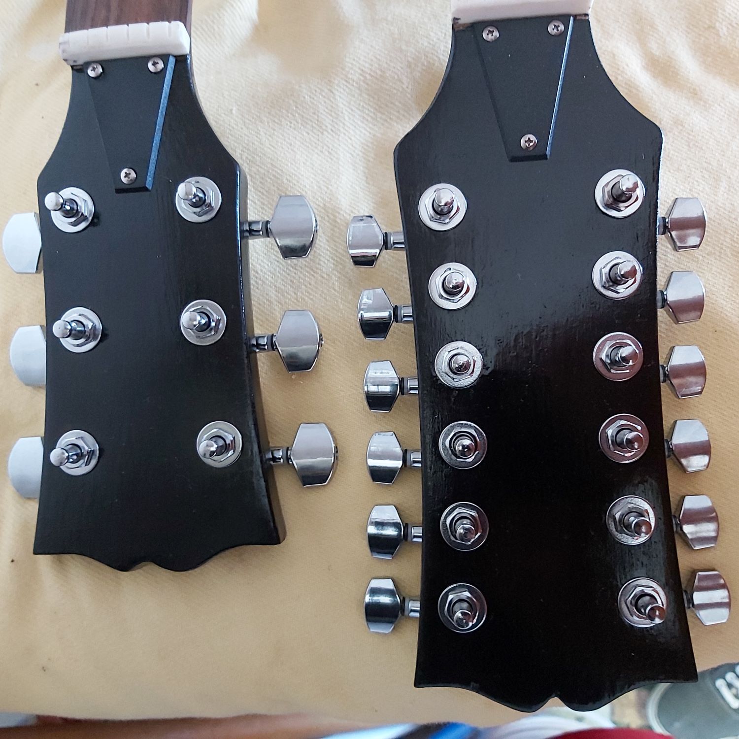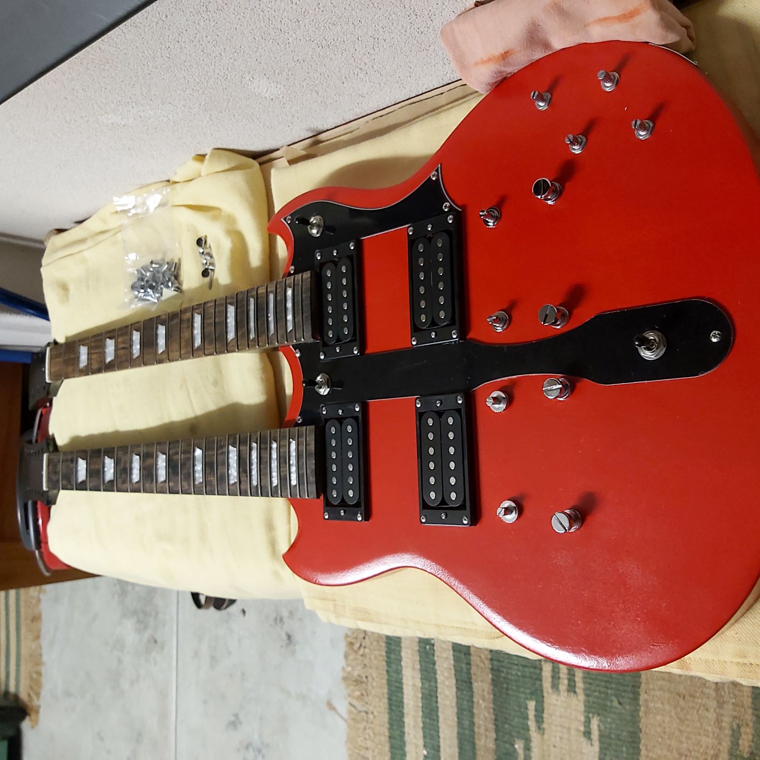 Received my sixth PB kit mid-June. First glance a challenging set of wiring!! Three switches and metres of wiring (just kidding). Did a fair bit of sanding to remove the rough edges and gave it a coat of white undercoat. Applied sand sealer and then sanded the two necks. Chose some Black Japan prooftint and then varnish with about three coats followed by some Truoil. Happy with the necks, Three coats of Wildfire red on the body. Then came fitting both necks and the truss rod covers. Laid out some wiring to get a hang of the possible sizing through the many holes pre-drilled in the body. Then today used the supplied coloured wiring to lay out the routing of them.Attachment 43289Attachment 43290Attachment 43291Attachment 43292Attachment 43293