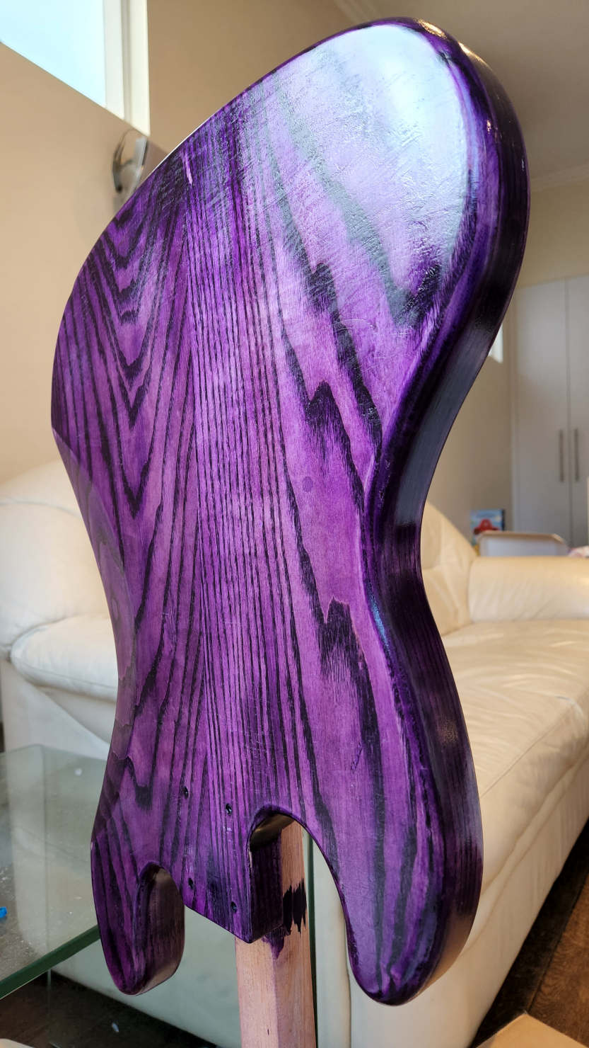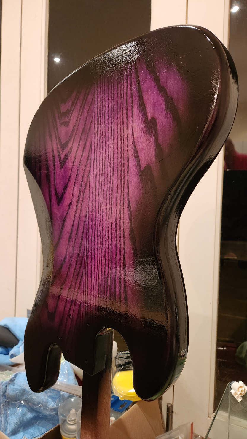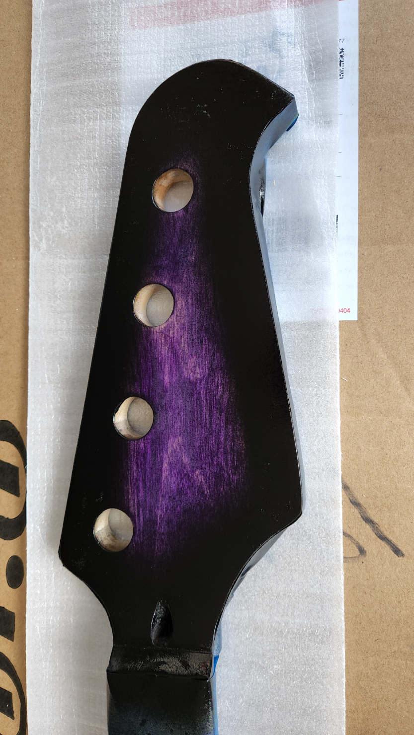 I'm aiming for a black burst over a dark purple base with a glassy finish, and with a matching headstock. After reading many posts and watching many videos, I've settled on the following methodology: