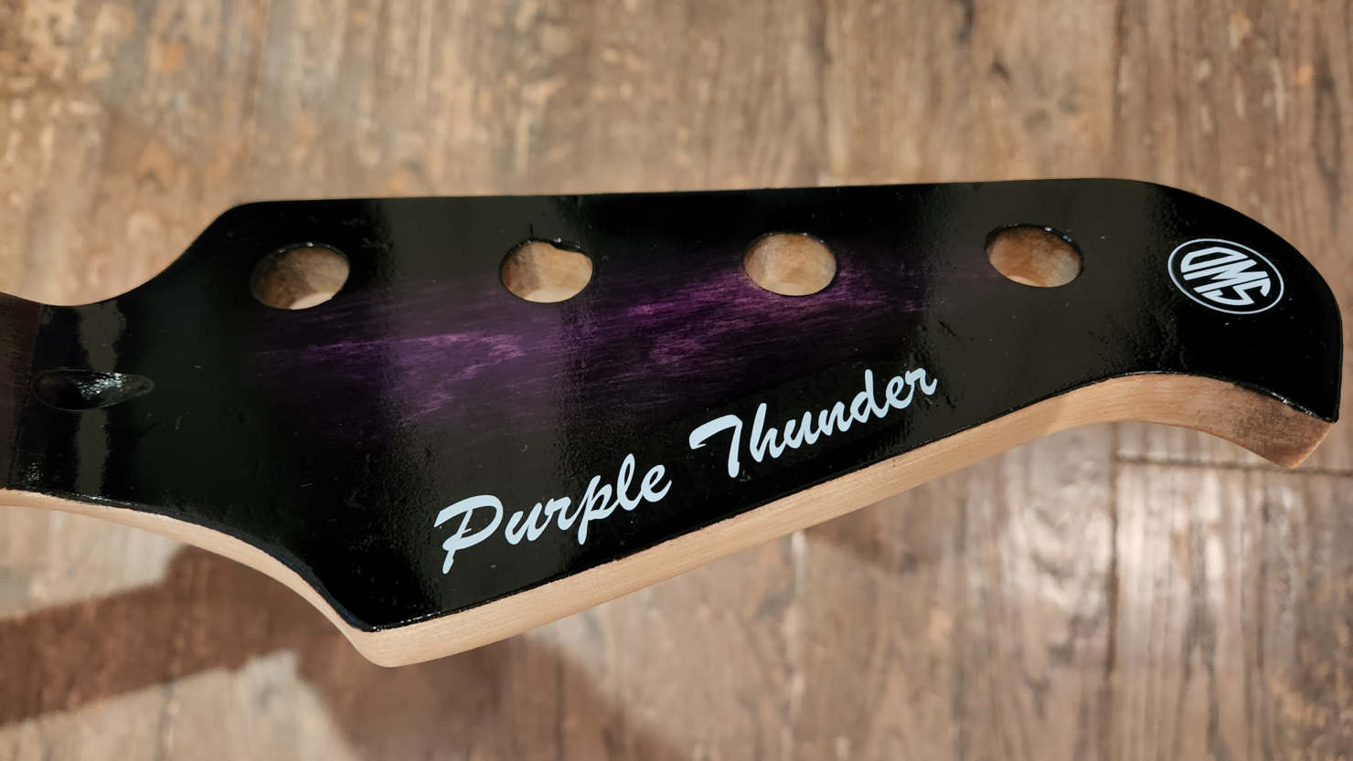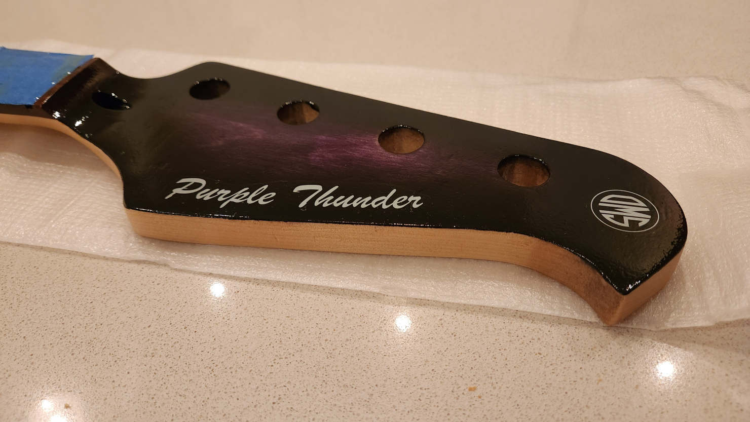 4. Apply Angelus Leather Dye Purple to headstock (1 coat, let dry 24hrs, lightly sand, let dry for 7 days)
