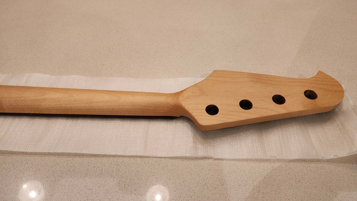 10. Apply 3 coats of Cabot's Clear Stain Exterior Aerosol (Satin) to headstock sides/back and neck), sanding to 2000 before final coat