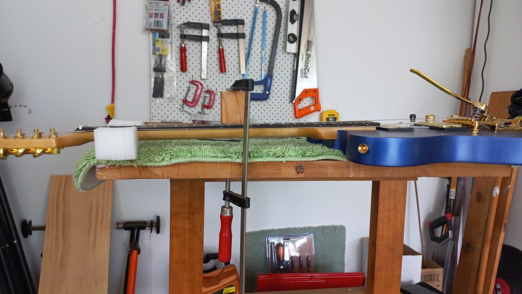However … there is no relief? When you hold down the string on the first and 20 fret the string sits on all the frets-no gap. I went through the truss rod adjustment video’s which said I had to loosen the truss rod. I managed about a full turn before it got stiff but no discernible change in the neck bow. They say don’t force the truss rod when it gets stiff, but no one gives a definition of ‘stiff’. I saw a video a number of months ago where they had the neck by itself on the bench, supported at the ends, and a clamp in the middle applying relief. Would anyone recommend trying this.? Any other ideas would be greatly appreciated. It looks good, but I would like to be able to play it too.