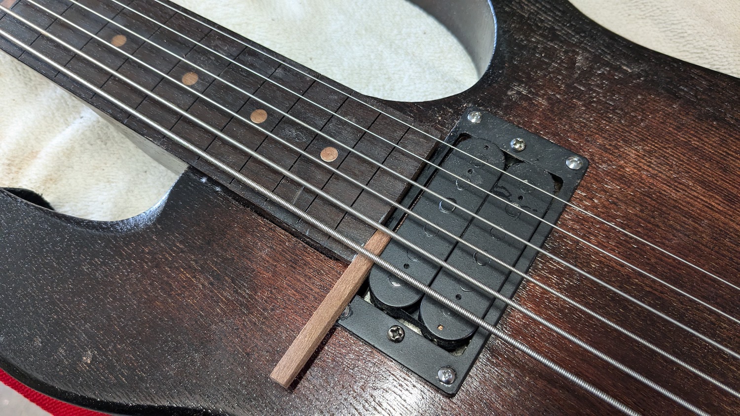 I didn't want to press those pins down all the way for this test (before sanding, finishing etc..), so instead I just packet a tiny bit of timber under the bridge, measuring the bridge (& pins) at a fairly medium/high position.