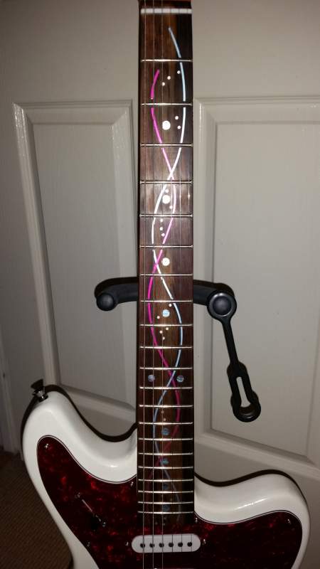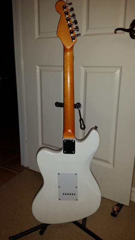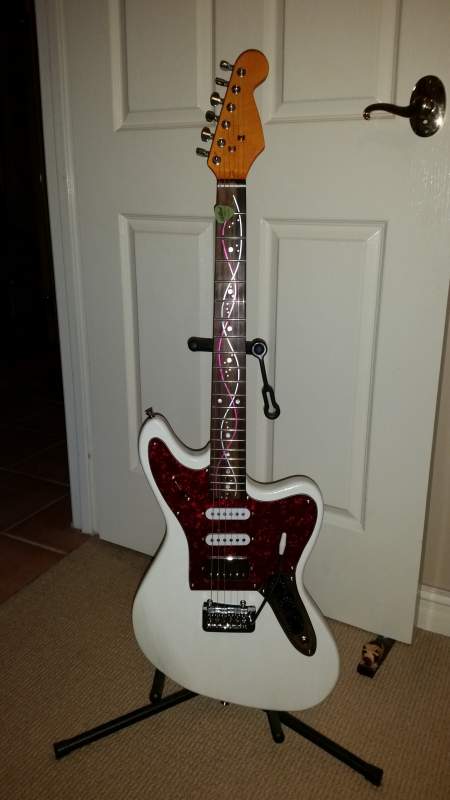 Its an ST-1 kit finished in pearl purple and black back/sides. Headstock veneer is camphor. Neck is a very thinned down yellow stain.